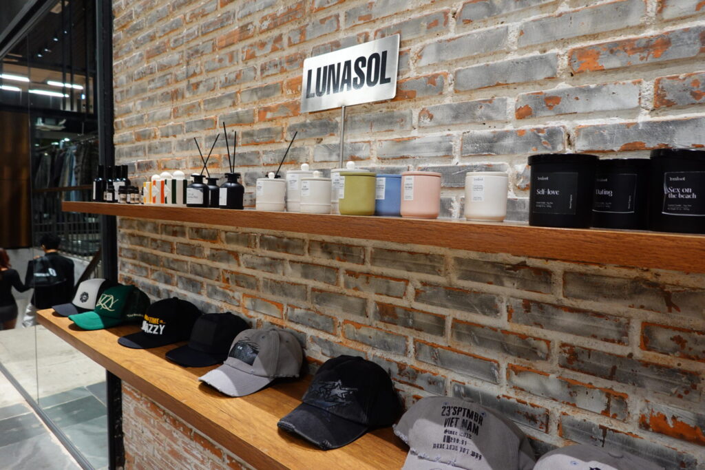 ファッションの熱狂を和らげるような雑貨コーナーも。アロマキャンドルやハットは、視覚的な刺激の多いフロアにおいて、嗅覚や感性に訴えかける癒やしのアクセントのような存在。