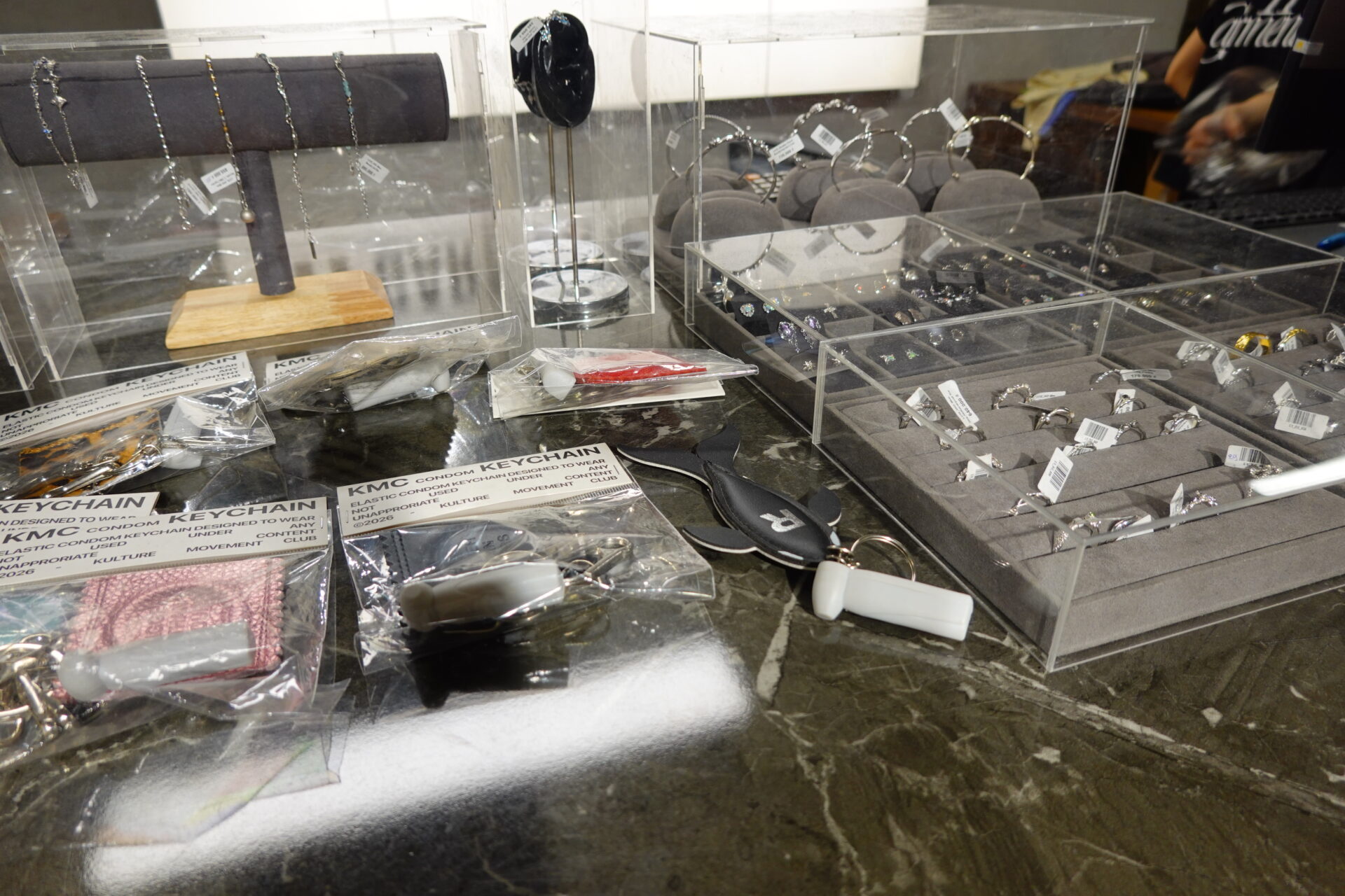 レジ前にはアクセサリーやキーチェーンなど。こういう実用性度外視のデカいキーホルダー、嘗てのギャル文化(ストラップとか)を思わせて良いですね…と思ってたら、モチーフはまさかのコンドーム。何事!?