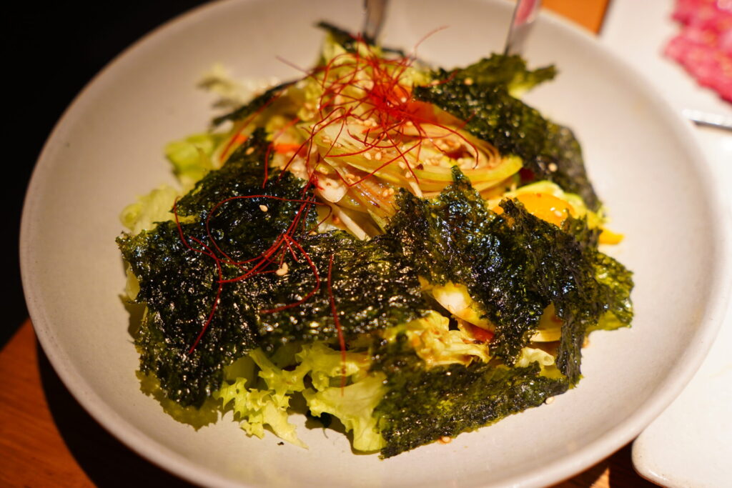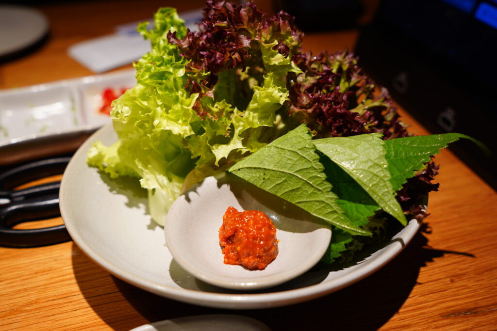 チョレギサラダと包み野菜。野菜も見るからにキレイ。「ハイッッッ」と自己主張しているような、生き生きとした新鮮さがあります。