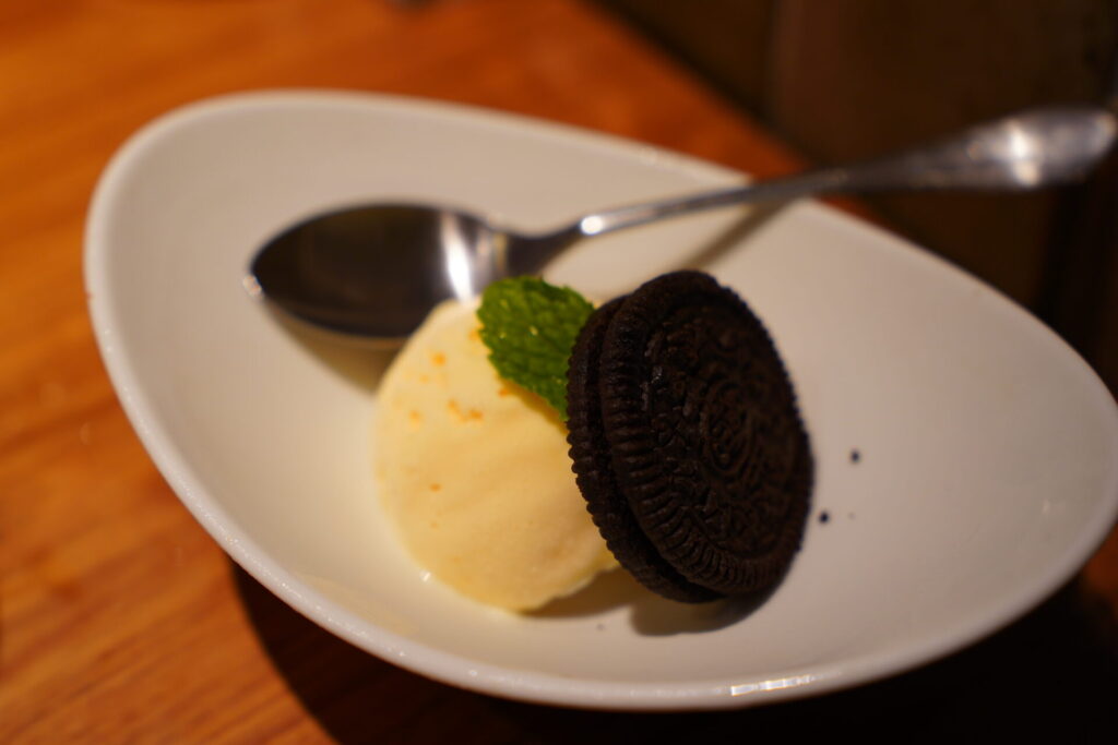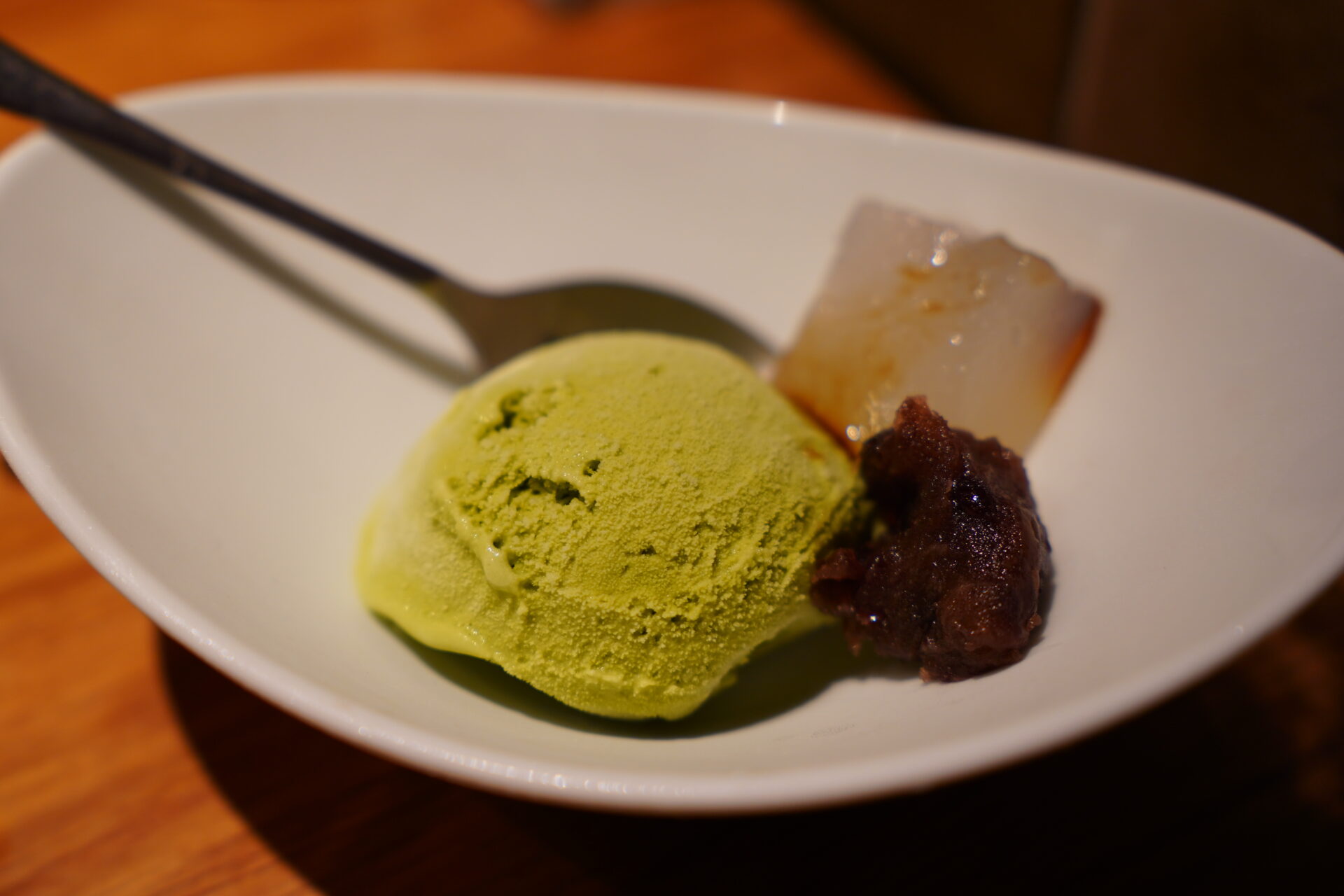最後は濃厚なバニラアイスや、つぶあんとわらび餅が添えられた抹茶アイスで締めくくり。和の余韻に浸りながら至福のディナーを終えました。
