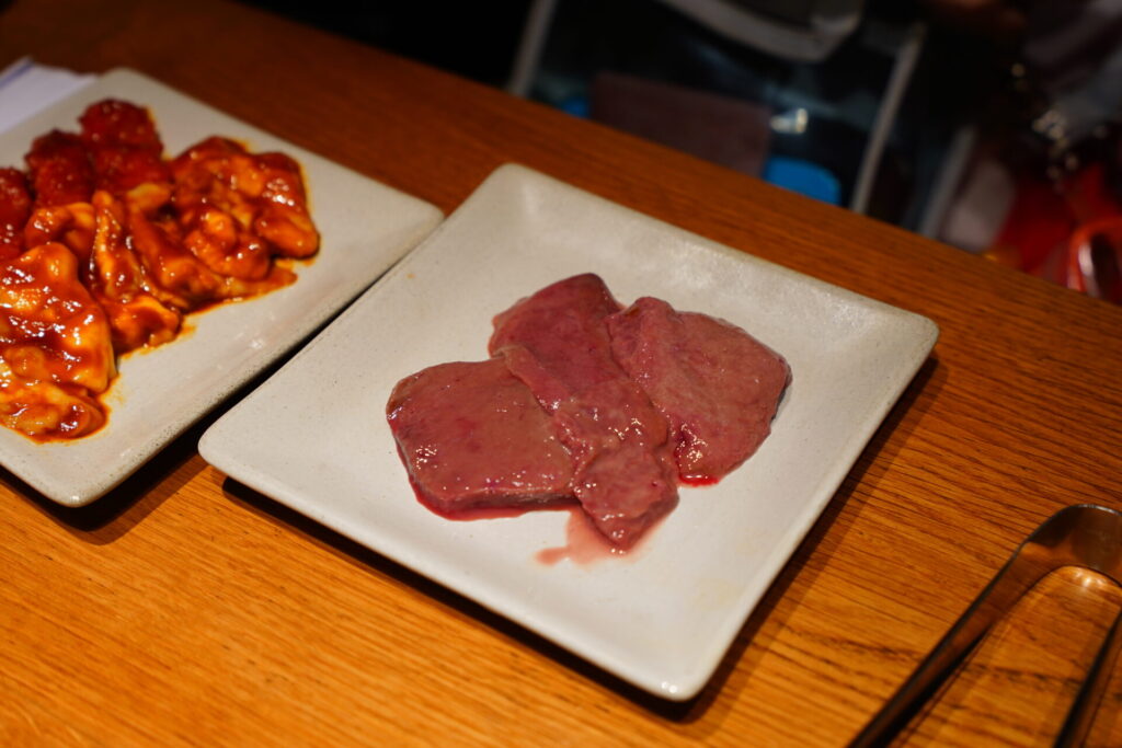 ホルモンやレバーの鮮度も良し。艶やかなレバーや、旨辛だれがしっかり揉み込まれたホルモンは、食べ放題であることを忘れさせる。