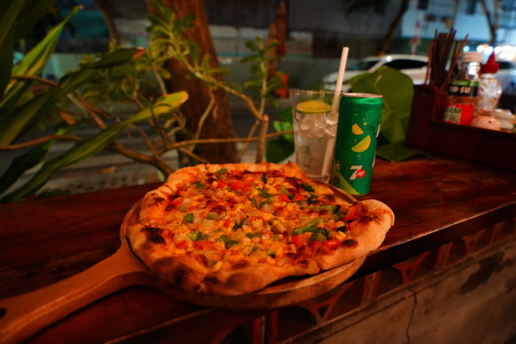 大晦日の夜。自家製だという全粒粉生地を使ったベジタリアンピザ「Roasted veggies150,000ドンをいただきました。年越しピザですね(なんにも掛かっていない)。