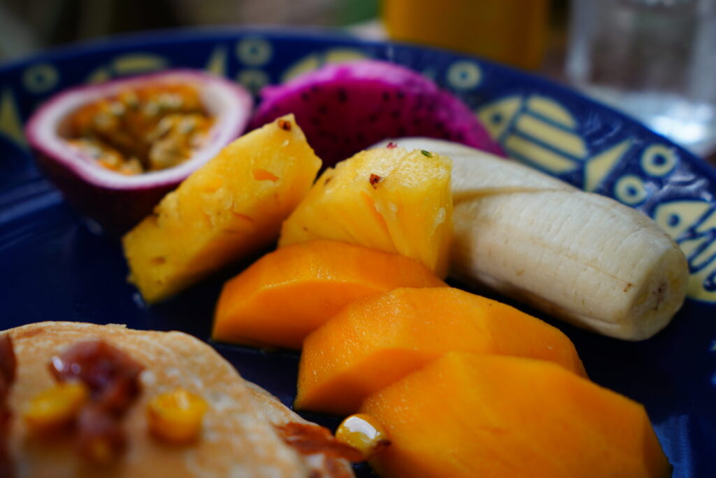 Savory pancake with corn, cheese, smoked sausage, bacon, fruits(セイボリーパンケーキ)」160,000ドン。パンケーキの傍らにはフレッシュフルーツが盛られており、彩り鮮やか。