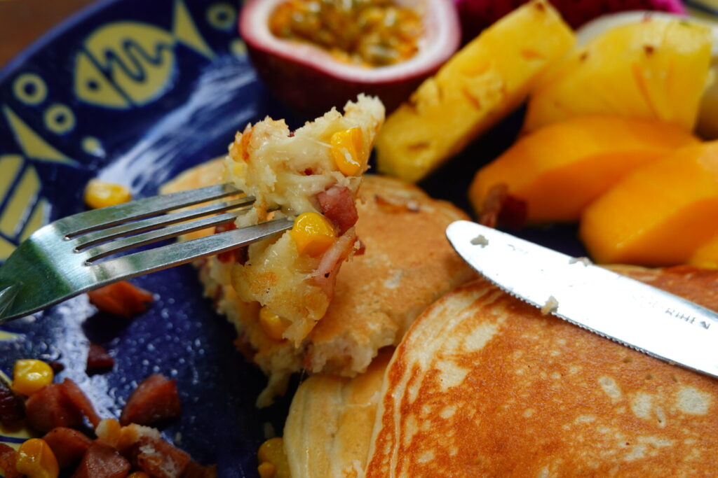パンケーキの生地には、チーズ・ベーコン・コーンなどが練り込まれいます。フォークを入れると中からチーズがとろりと溶け出し、スモークソーセージやベーコンの塩気とハーモニーを奏でる。