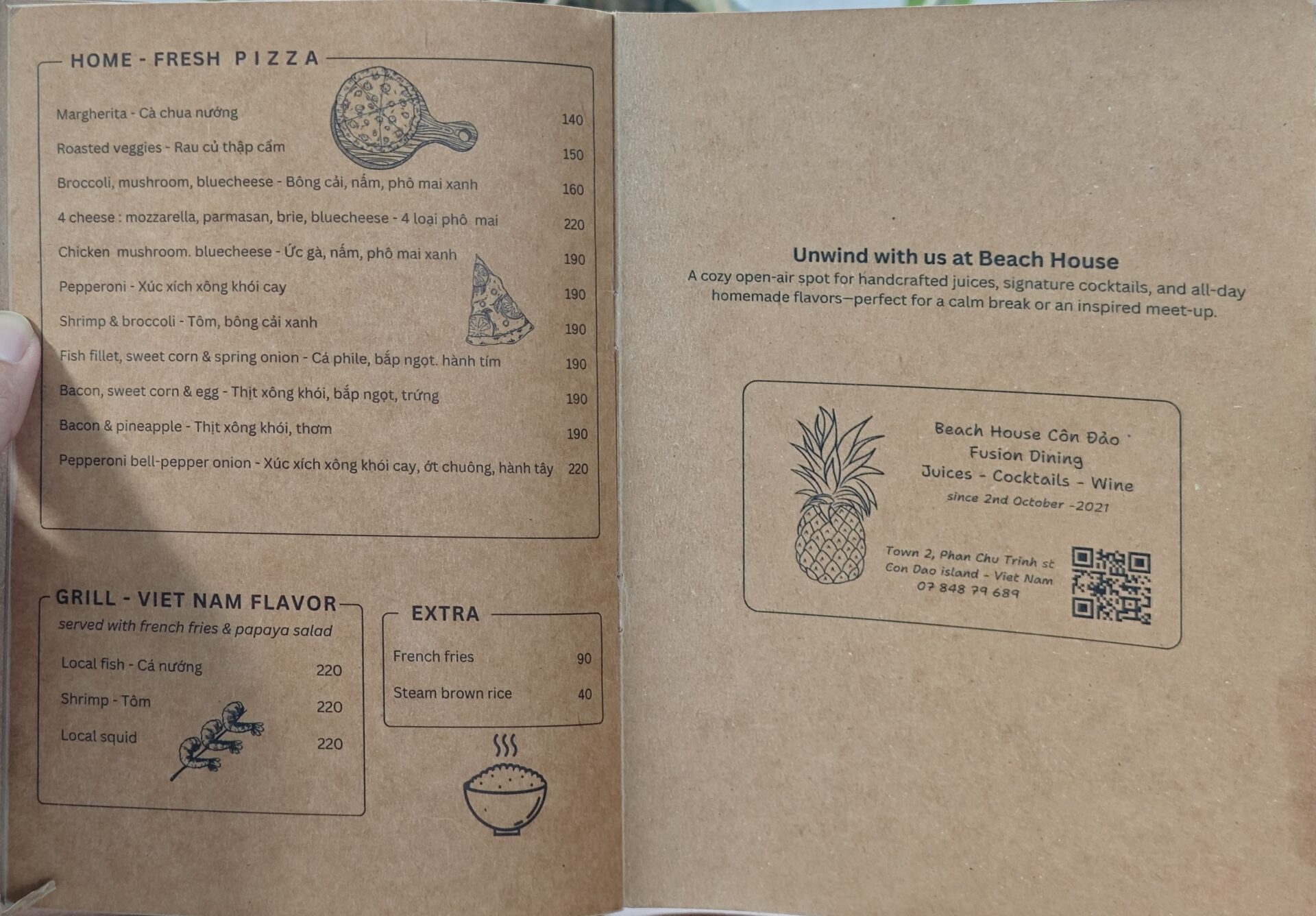 • フュージョン&ローカル: 手作りピザやサラダ、地元のシーフードを使った玄米プレートなど、多国籍なラインナップ。