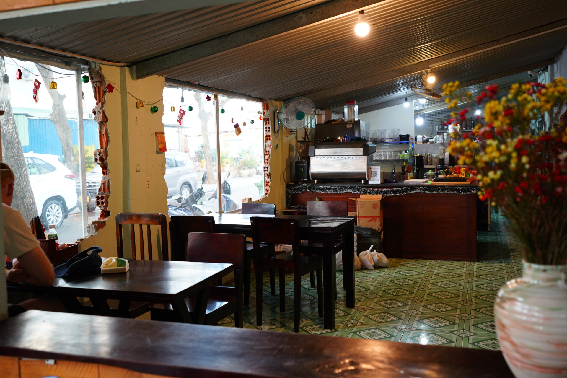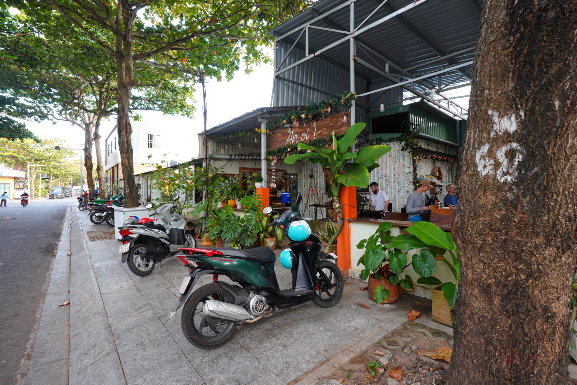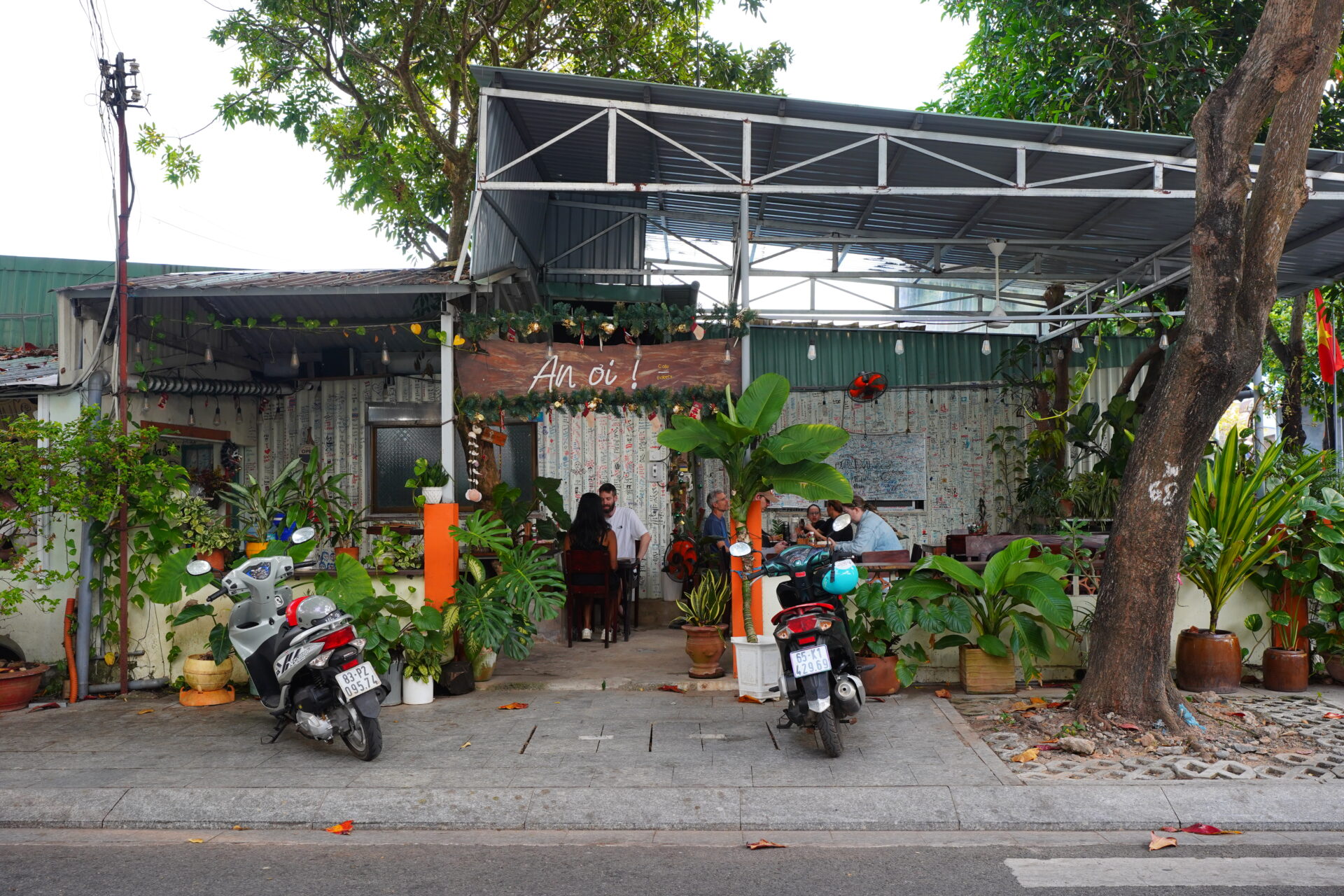 そしてこちらが「An Ơi Cafe & Restaurant」。お店はトタン屋根を活かしたオープンな造りで、外からも中の活気が伝わってくる親しみやすい外観。テラス席が中心なので、ふらっと入りやすいですね。