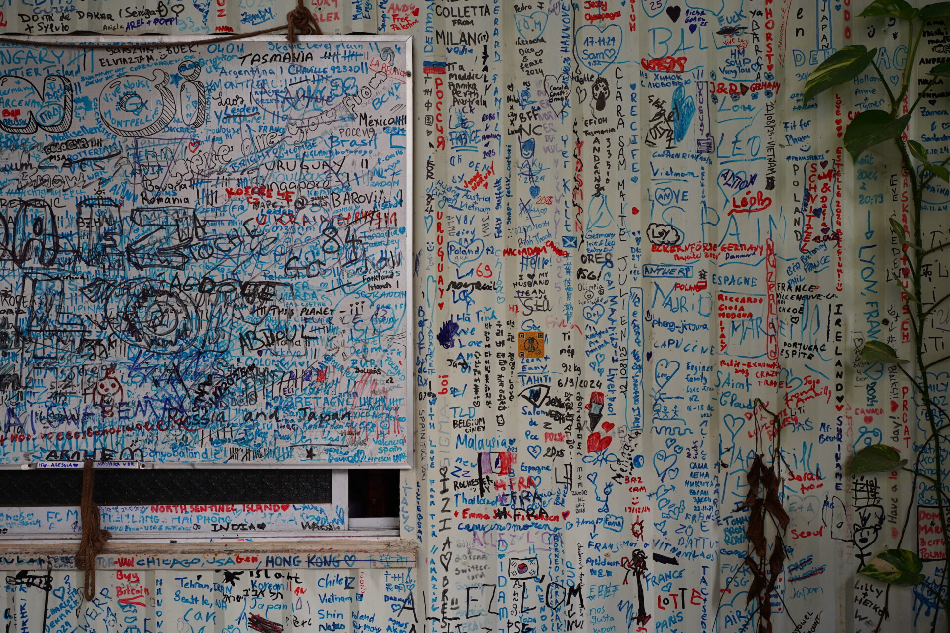 ハンガリー、フランス、スペイン、イタリア…世界中から訪れた旅人たちの足跡が刻まれており、ここが島の人々と旅人が交差する場所であることを象徴しています。数は少ないけど、一応日本語もあったよ!!