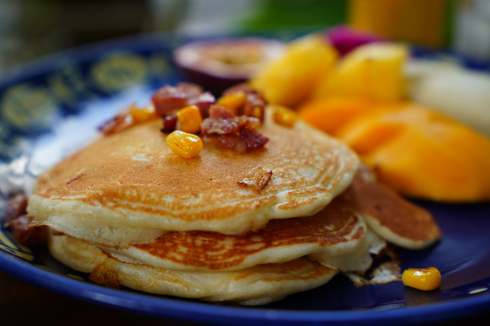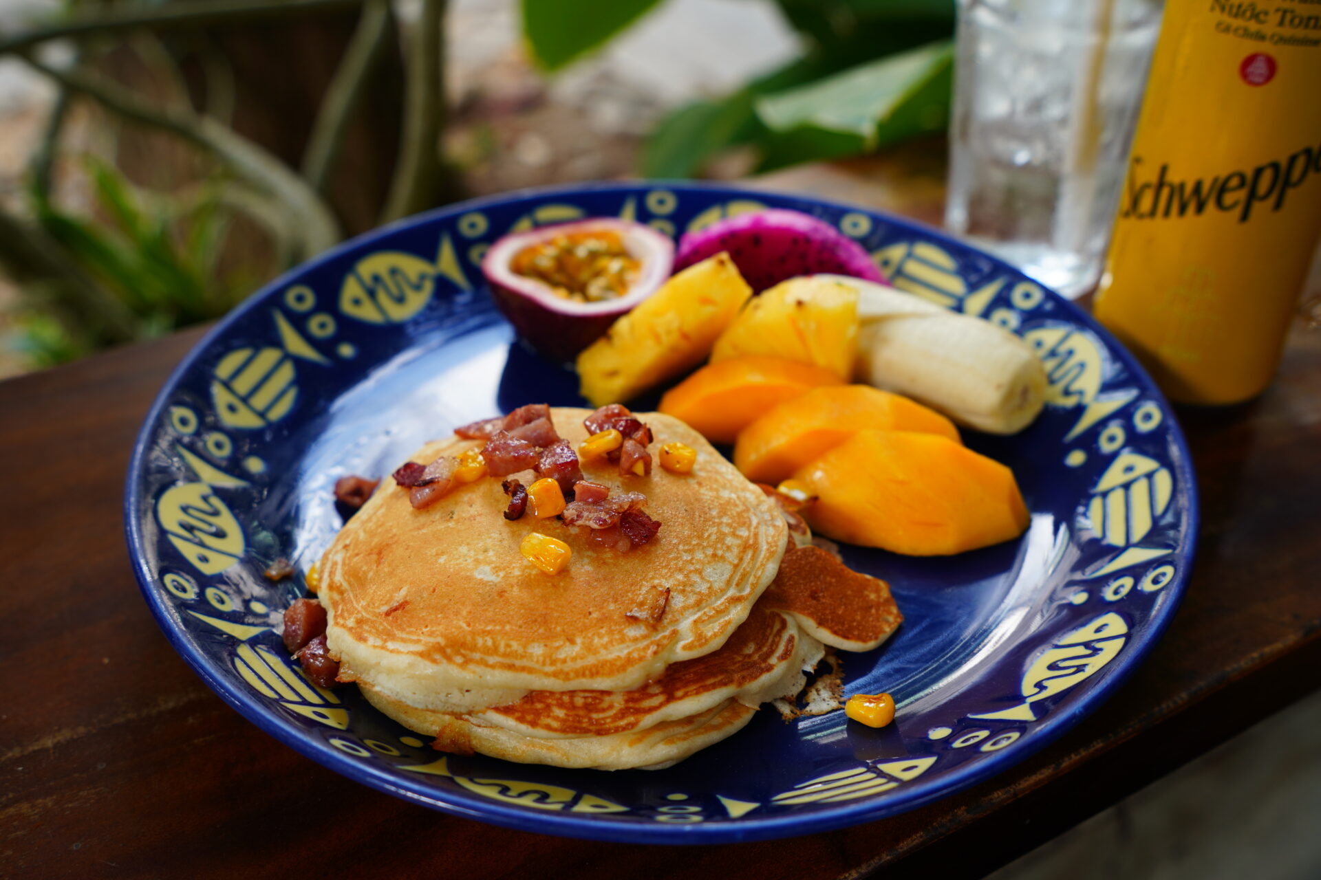 Savory pancake with corn, cheese, smoked sausage, bacon, fruits(セイボリーパンケーキ)」160,000ドン。パンケーキの傍らにはフレッシュフルーツが盛られており、彩り鮮やか。