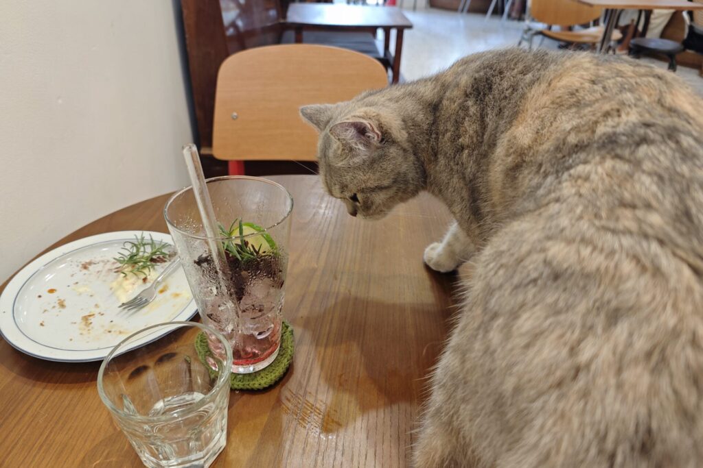 突然近づいてきたと思いきや、テーブルにぴょいんと乗っかって私の食後の皿に興味を示すネコチャン。そして…?