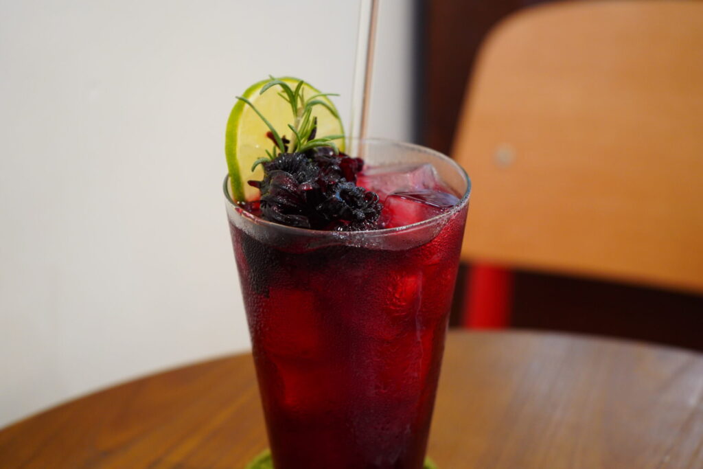 バナナブレッドのお供に選んだのは、「ハイビスカス・ジンジャー」。吸い込まれそうな鮮やかなルビーレッドが美しい一杯。シロップ漬けのアーティチョークの花がトッピングされており、インパクト大。