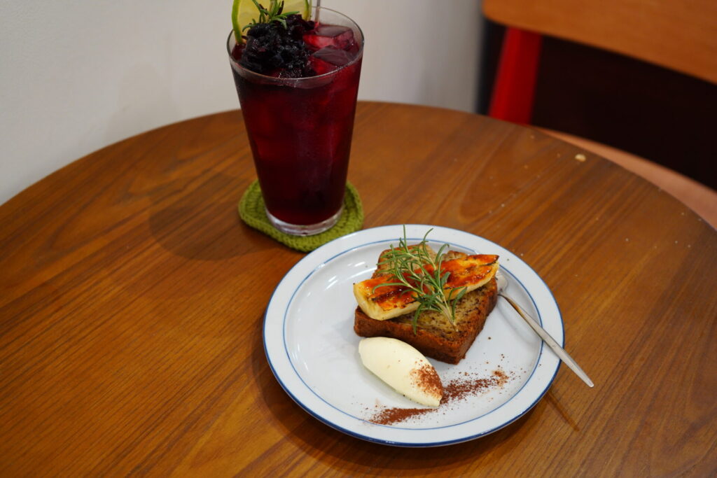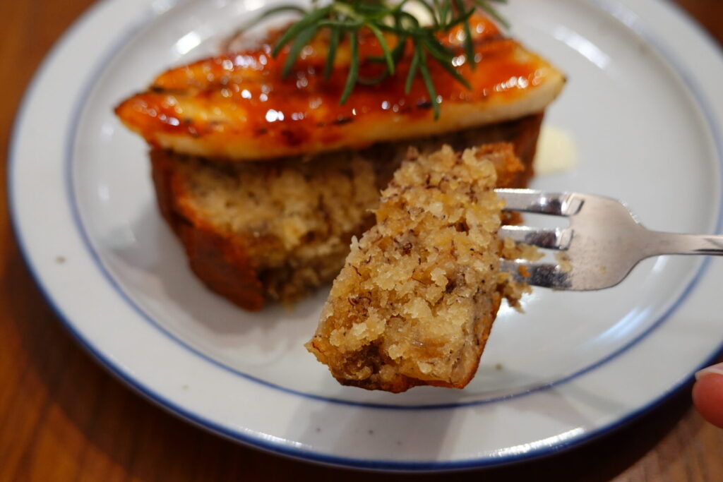 大胆に乗せられたキャラメリゼバナナと、ちょこんと添えられたローズマリーが目を引くバナナブレッド。リベイクされて仄かに温かい生地は、パサつき感はなく、バナナのねっとりとした甘みが口いっぱいに広がります。