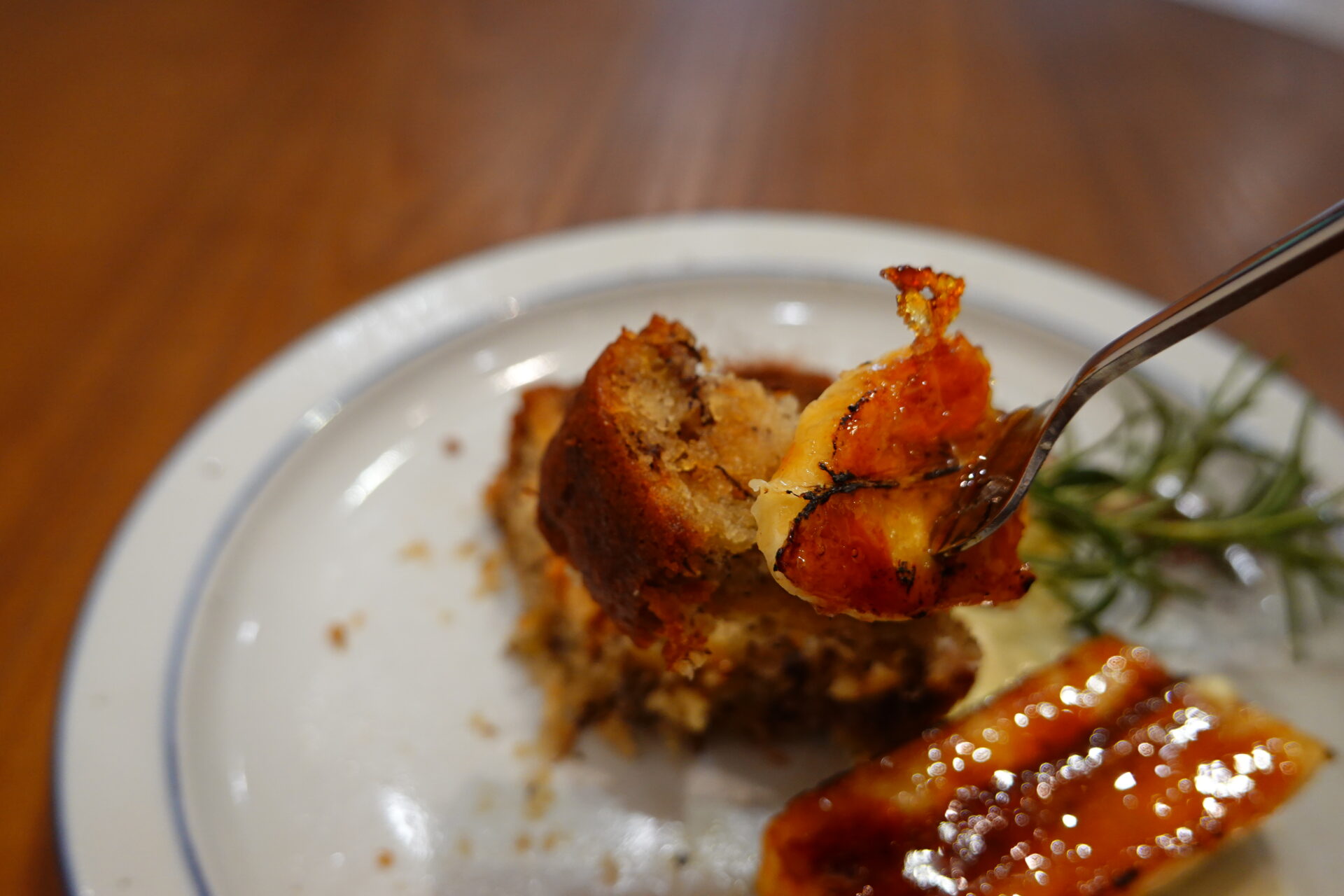 大胆に乗せられたキャラメリゼバナナと、ちょこんと添えられたローズマリーが目を引くバナナブレッド。リベイクされて仄かに温かい生地は、パサつき感はなく、バナナのねっとりとした甘みが口いっぱいに広がります。
