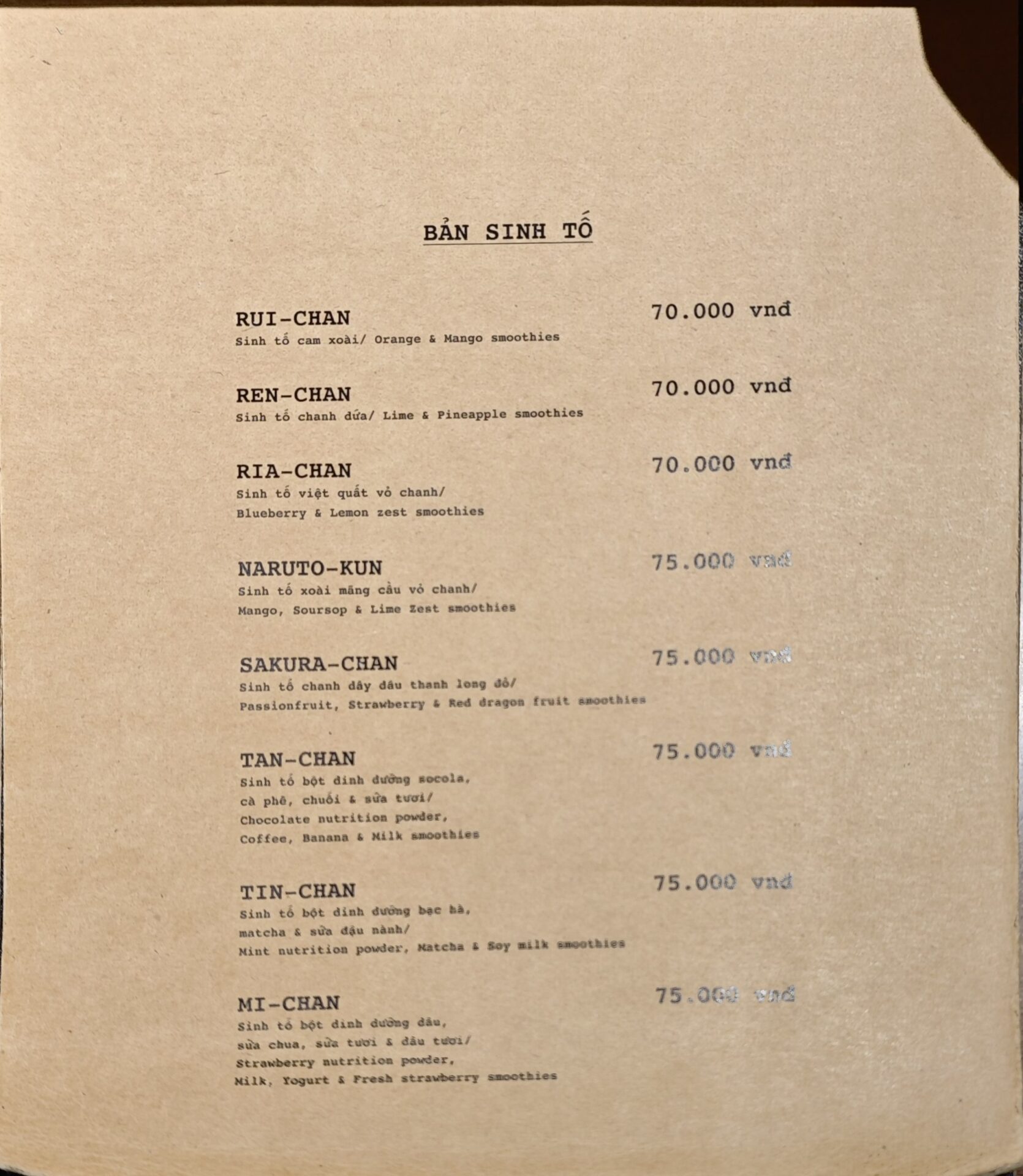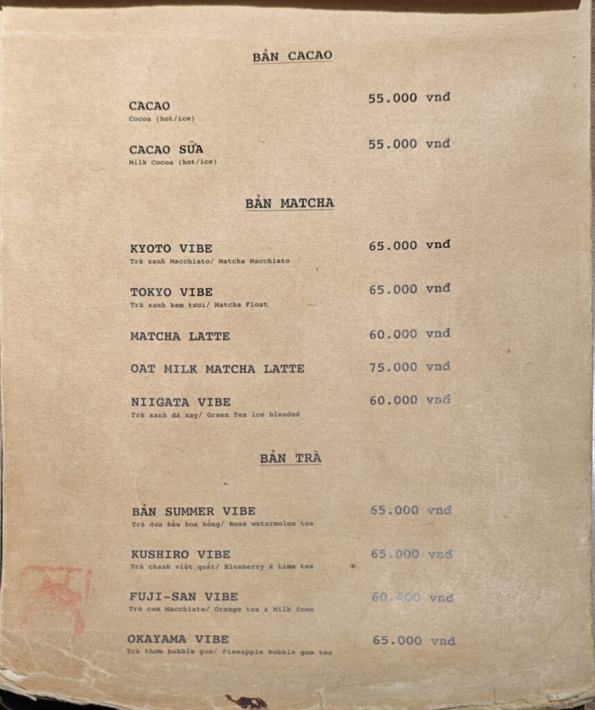 「BẢN Cà Phê」のメニューはこちら。遊び心に満ちていますね。お茶系のメニューには日本の、ヨーグルトやジュースにはベトナムの観光地の名前が付けられています。さらにスムージーは「NARUTO-KUN」「SAKURA-CHAN」といったネーミング。