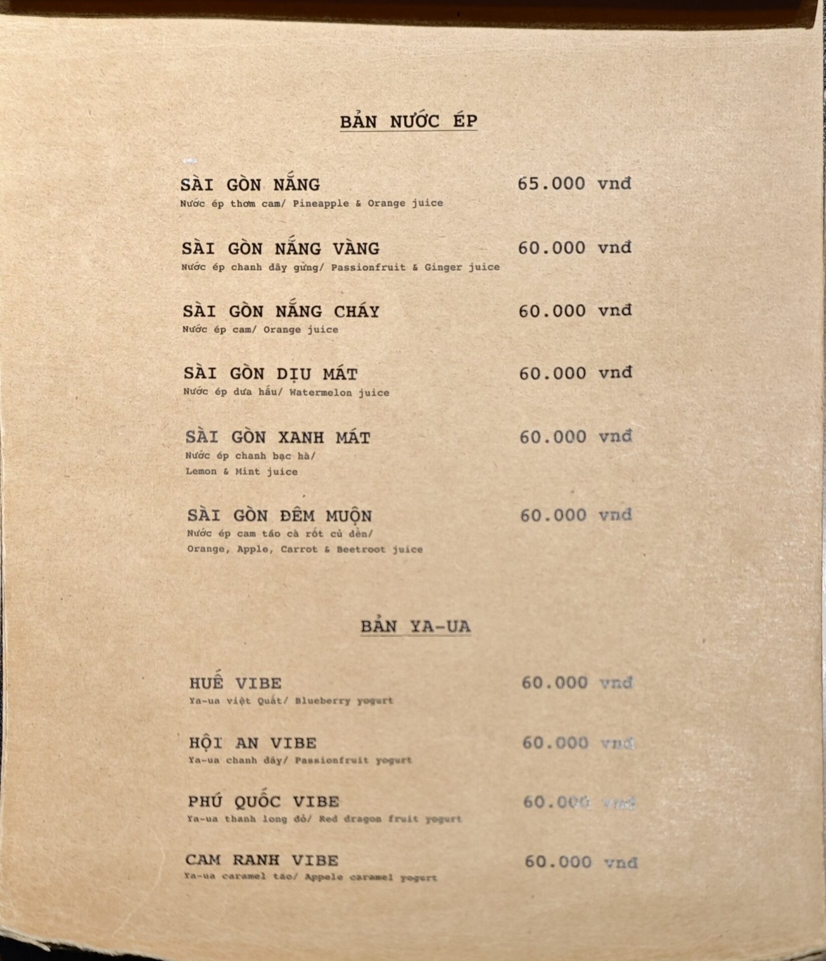「OKAYAMA VIBE」65,000ドン。メニューの説明を読むと「パイナップル&バブルガム」とのこと。岡山といえば桃やマスカットでは…。