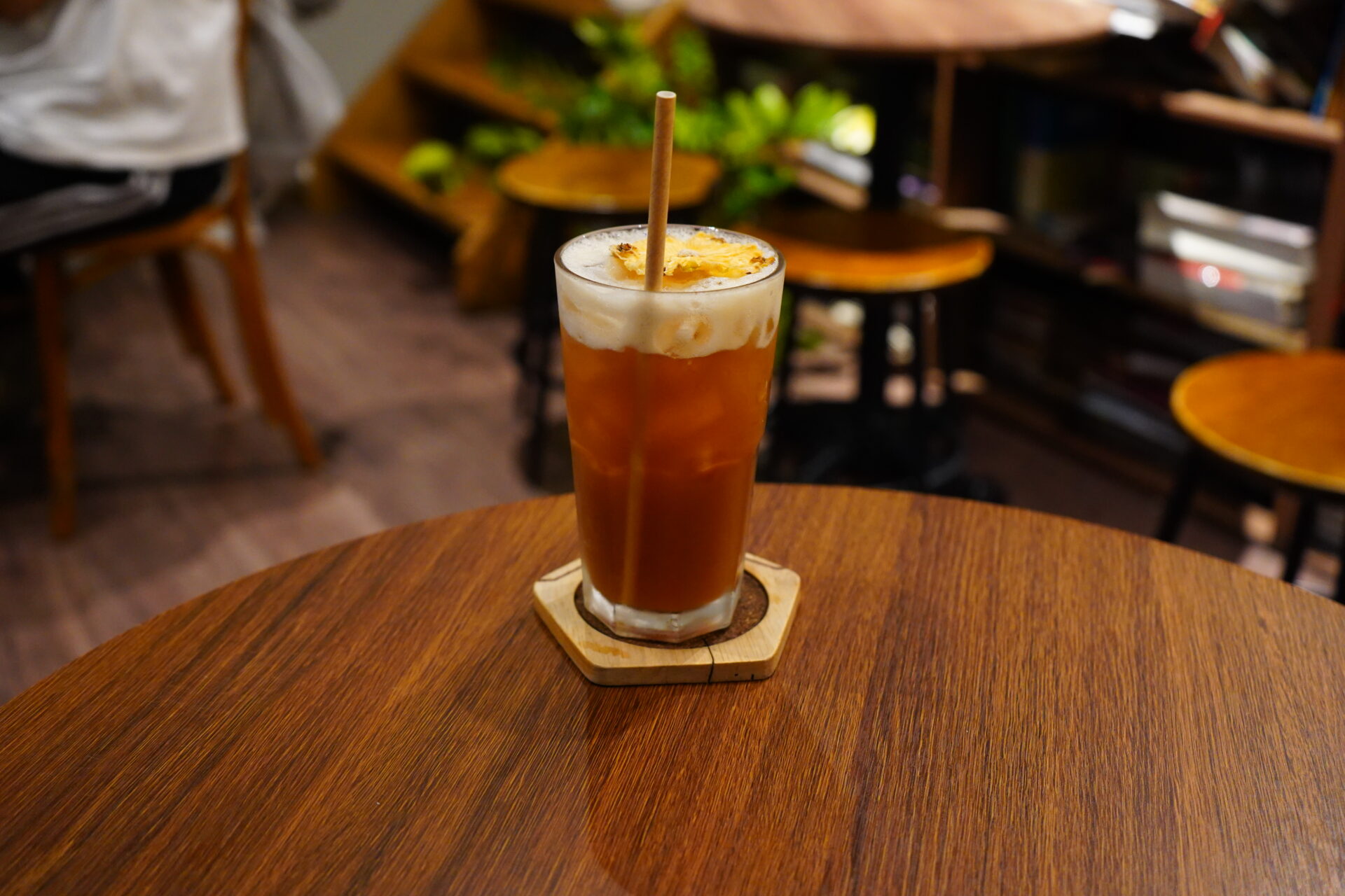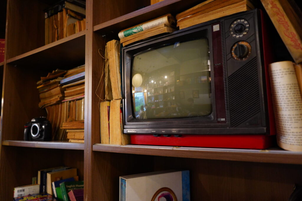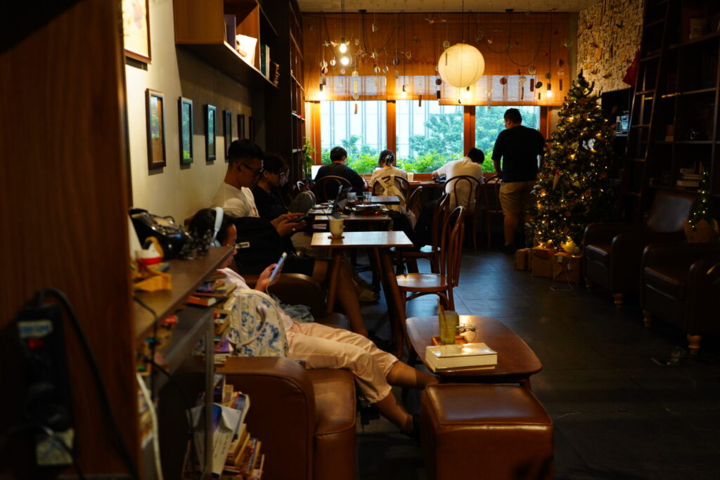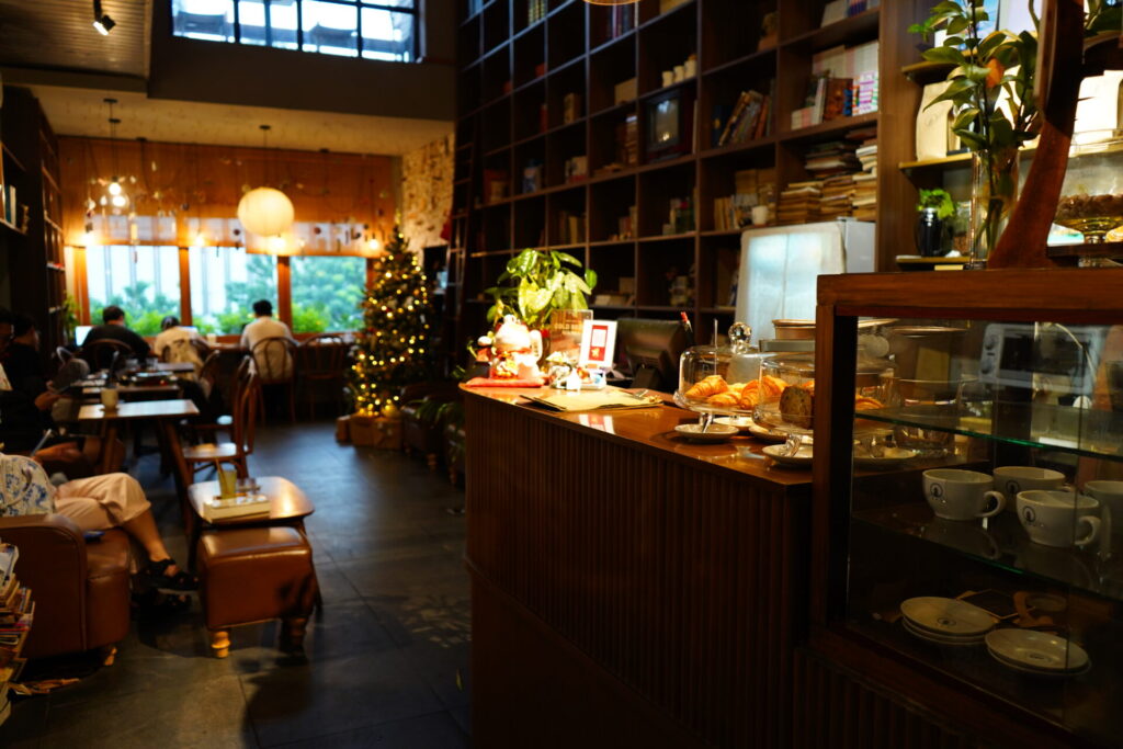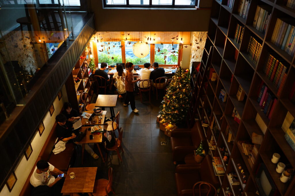 ハイライトは何と言っても、吹き抜けの高い天井まで届く巨大な本棚。空間を圧倒的な存在感で支配しています。無数の本がぎっしりと詰め込まれたその光景は、以前訪れた「Nhâm Cafe」を想起させます。