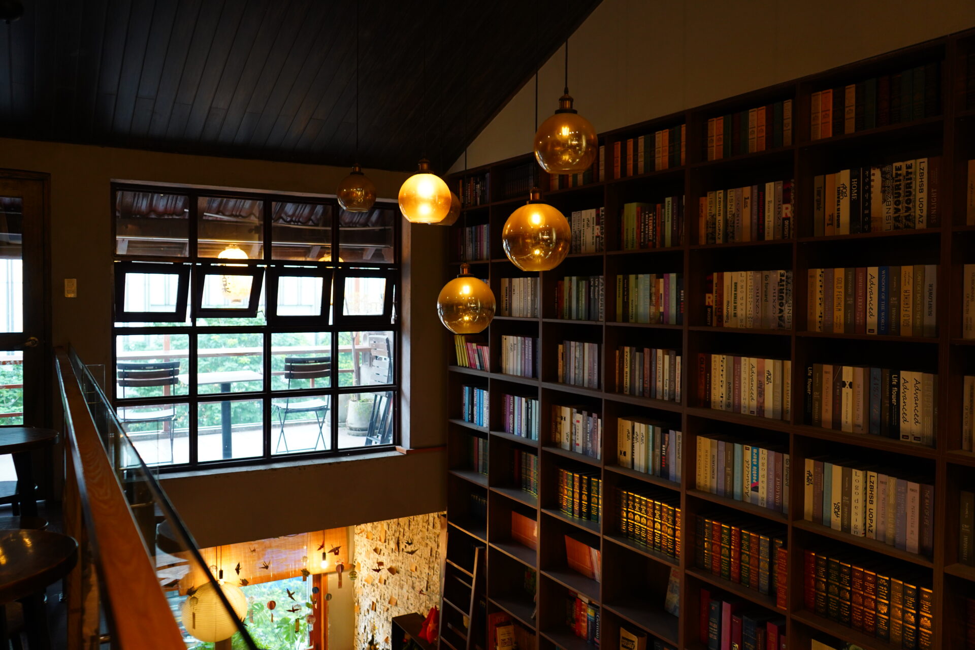 天井から吊るされた琥珀色のペンダントライトや、和紙のような丸い提灯照明が、本棚を温かく照らし出し、幻想的な陰影を作り出していますね。