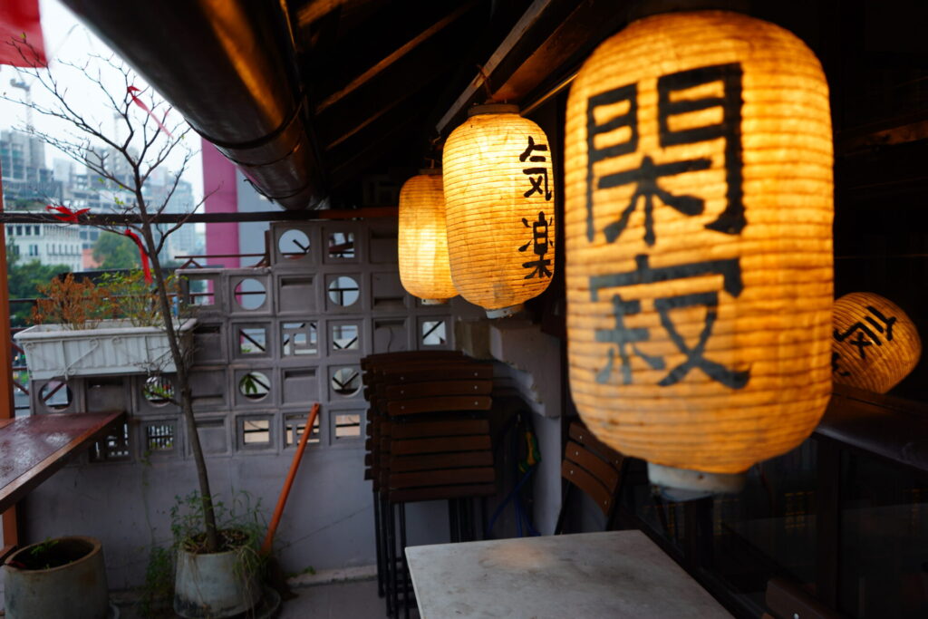 「気楽」「閑寂」と書かれた提灯が揺れるバルコニー。