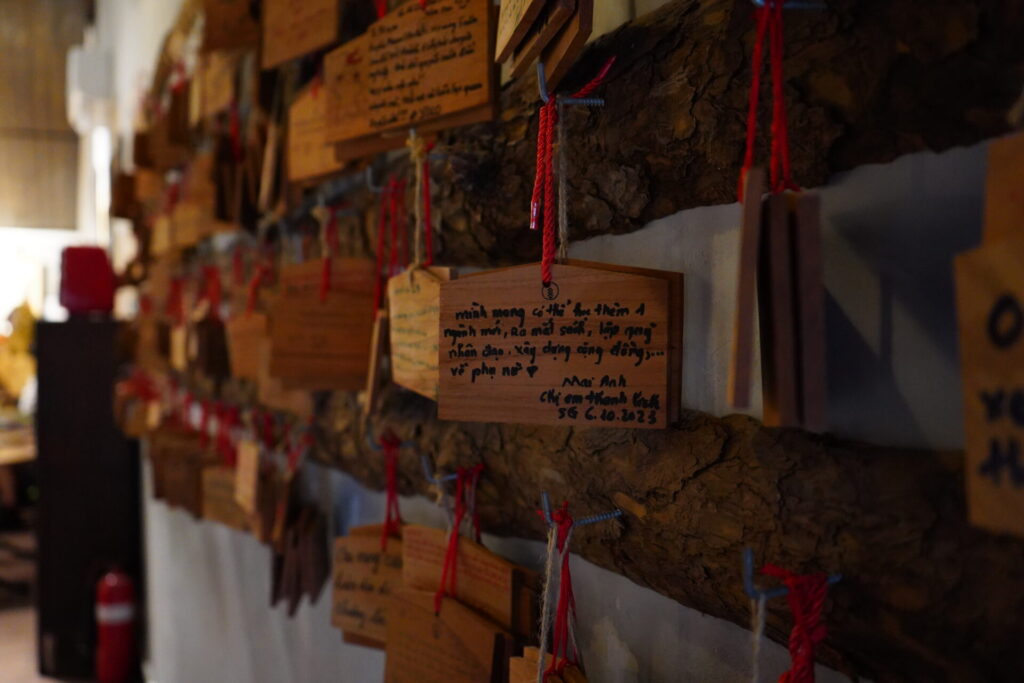 木の札にはたくさんのメッセージ。ベトナム語、英語、そして日本語。「試験に合格しますように」「家族が幸せでありますように」…国や言語は違えども、人が願うことは同じなのである。