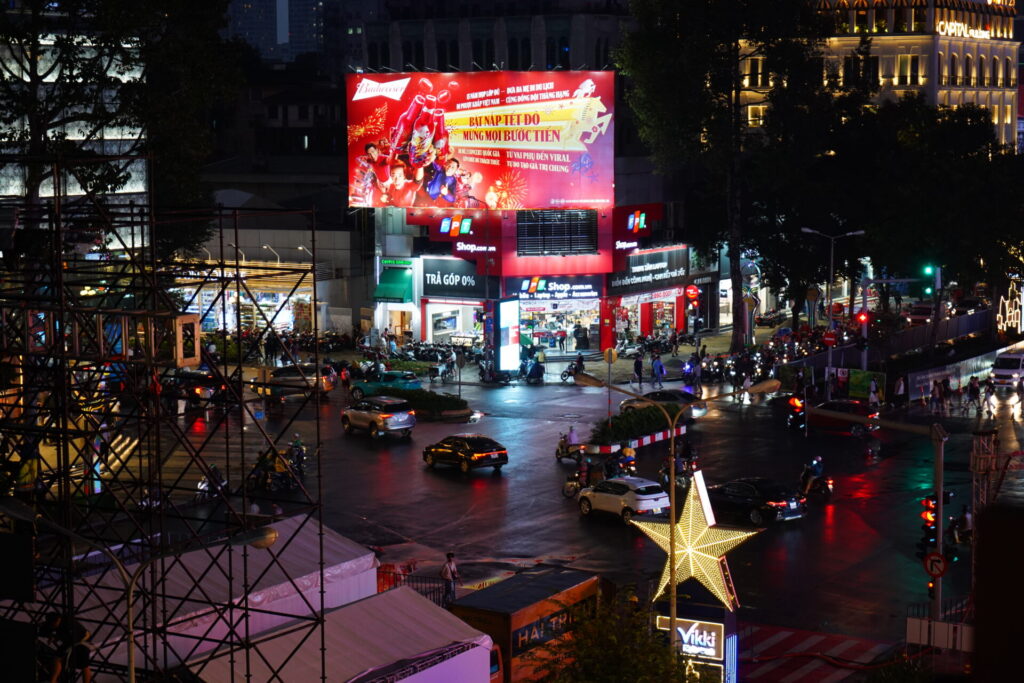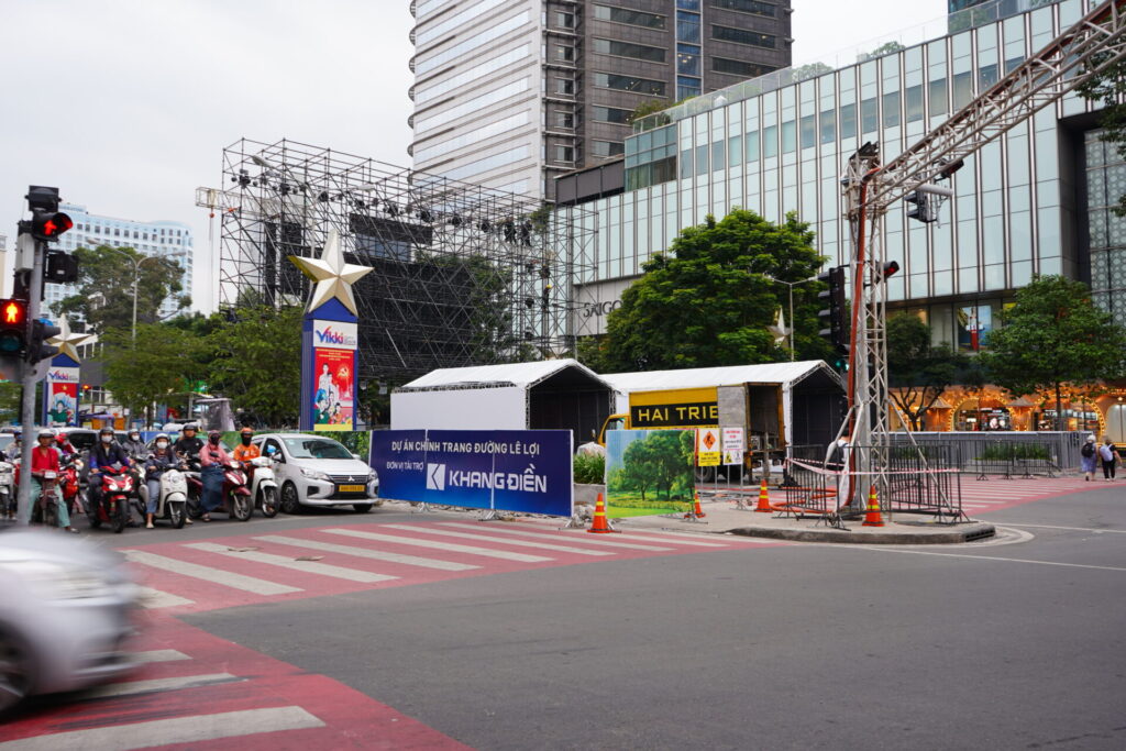 ホーチミン市の中心を貫く目抜き通り・レロイ (Lê Lợi) 通り。すぐ目の前には、煌びやかなデパート「サイゴンセンター(高島屋)」がそびえ立ち、通り沿いでは年末のイベントに向けた工事の囲いが街の変貌を告げています。ここはまさに、現代ホーチミンの「最前線」。