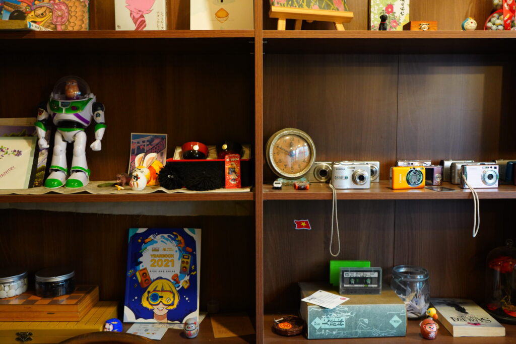 黒電話、ブラウン管の古いテレビ、カセットテープ、そしてオールドデジカメ。ごちゃごちゃしているようでいて、妙に調和しているこの空間は、何とも言えない郷愁を感じさせます。