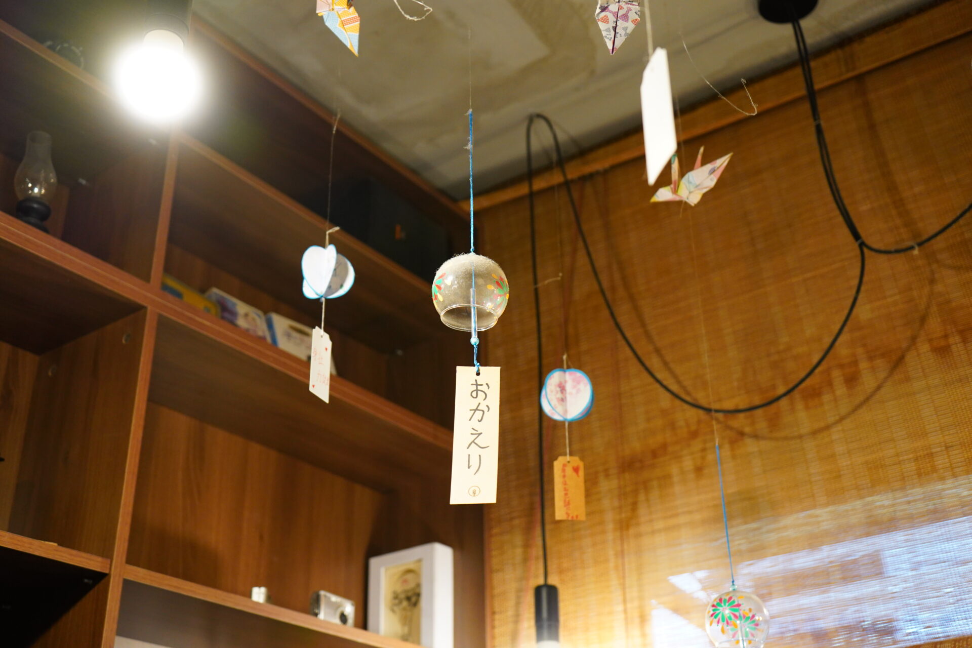 ふと天井を見上げると、たくさんの折り鶴と共に揺れる風鈴、そして「おかえり」の文字。