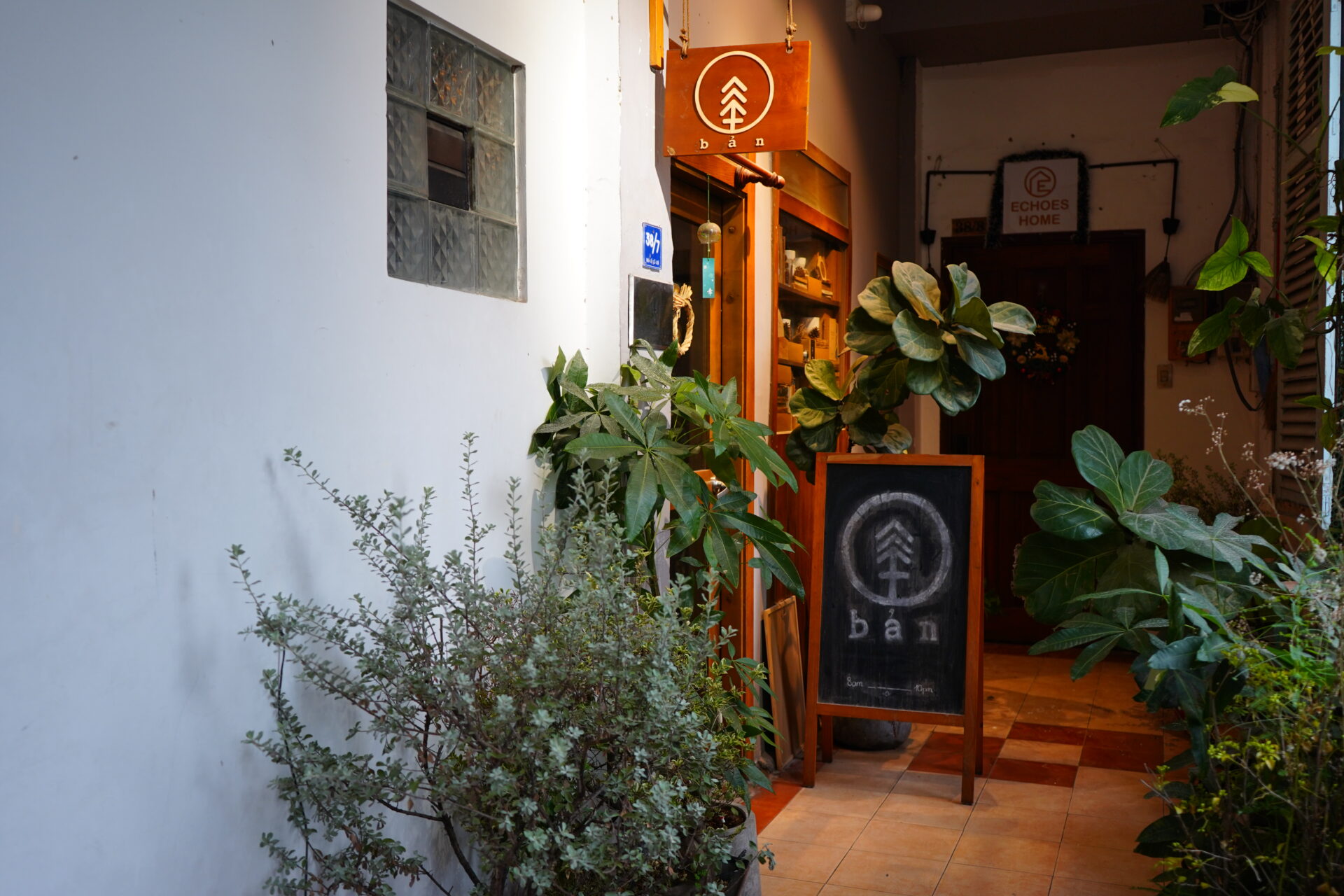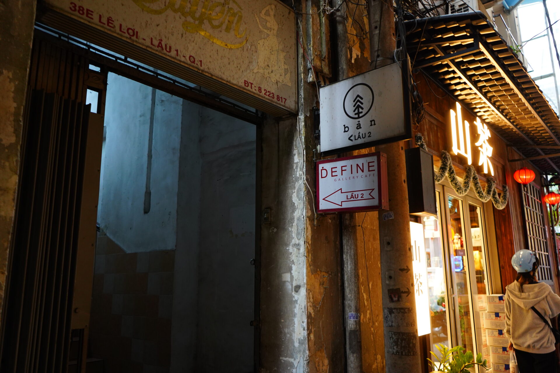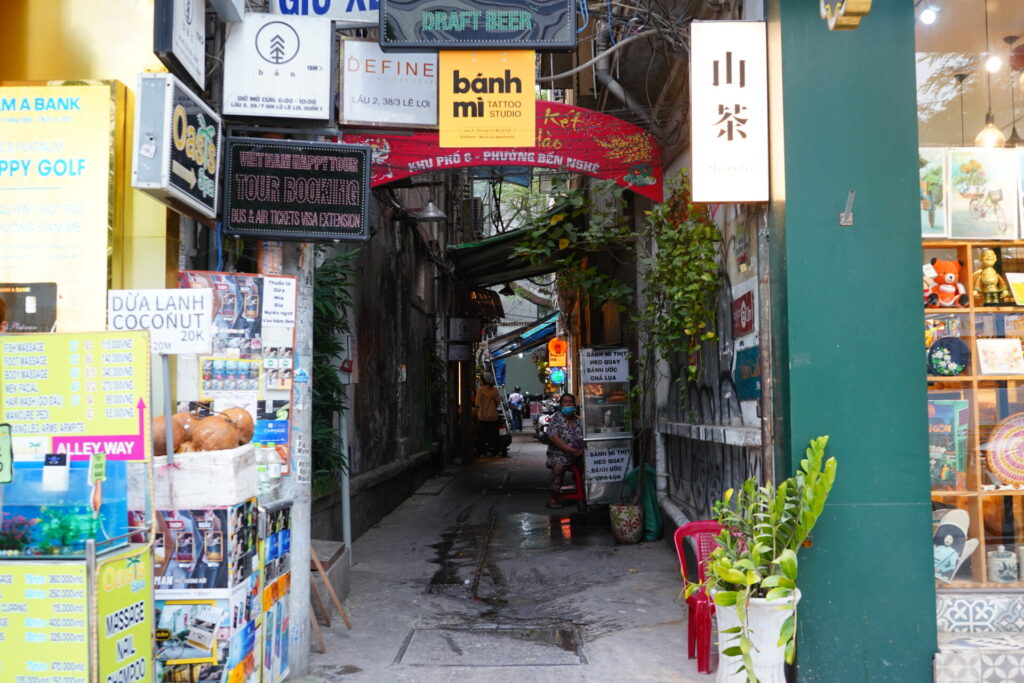 目指す「BẢN Cà Phê」は、そんな大通りの喧騒から身を隠すようにひっそりと佇んでいます。薄暗く、少し怪しげな路地(ヘム)の入り口。頭上に掲げられた小さな「BẢN」というロゴと矢印だけが、ここが目的地であることを示してくれています。