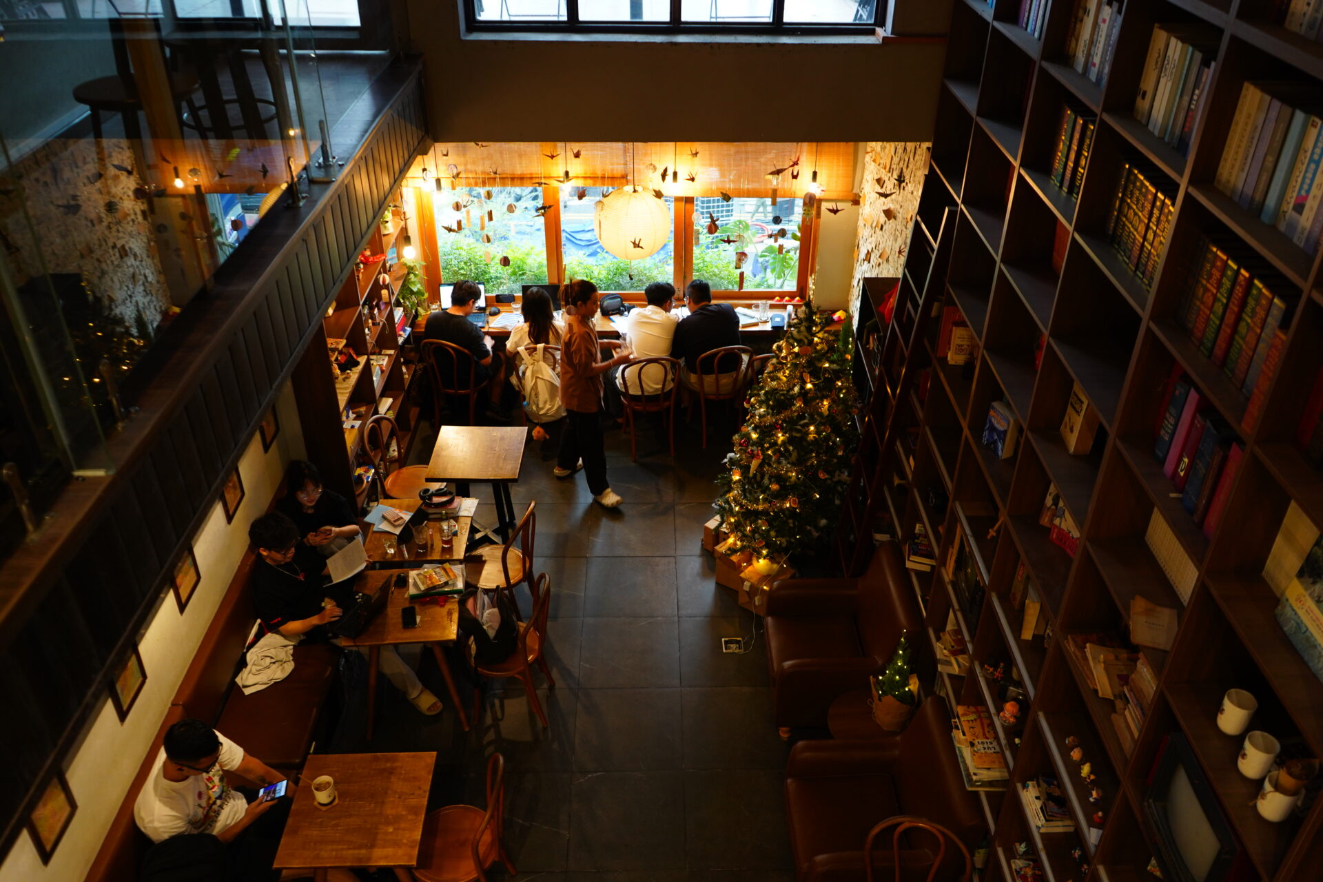 ロフトの手すりから下の階を見下ろすと、高い天井と本棚の全貌、クリスマスツリーの灯りが織りなすこのカフェ一番の絶景。