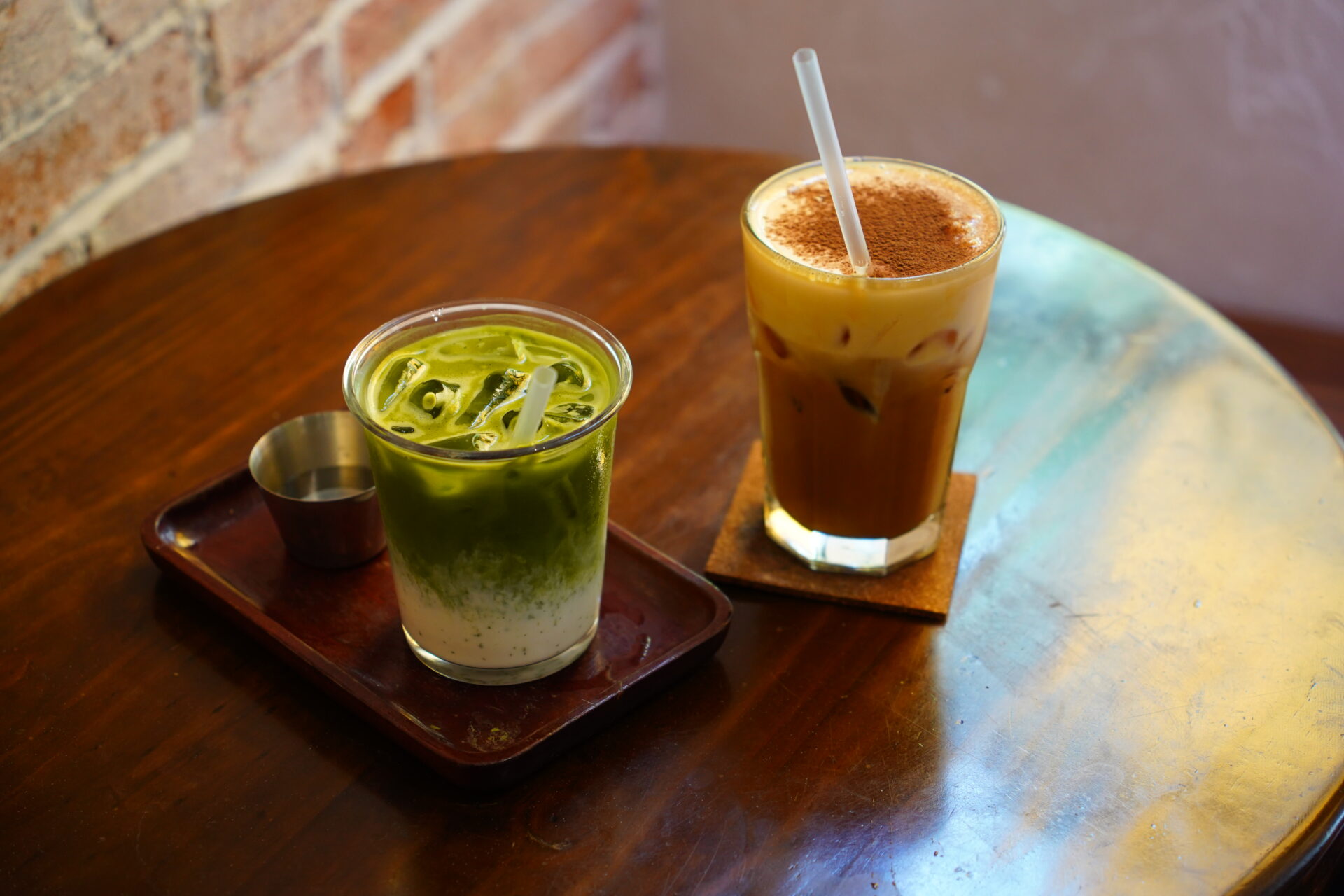 まずは1回目の訪問。「Matcha Latte70,000ドンです。一緒に写っているのは友人が注文した「Modern Egg Coffee70,000ドン