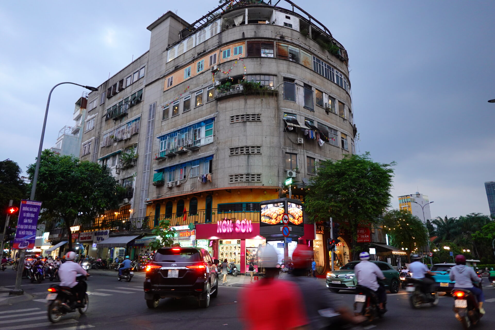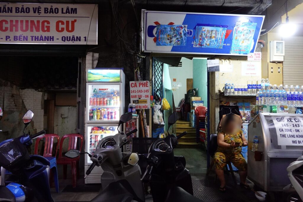 店舗が入居しているのは、上記画像の古い集合住宅。交差点の角に建っており、ベトナムの古い建築に見られる角が曲線になったデザインが特徴的。コンクリートの塗装が剥がれ、窓からは洗濯物が無造作に干されている…まさにローカル全開な佇まいでエモエモのエモです。