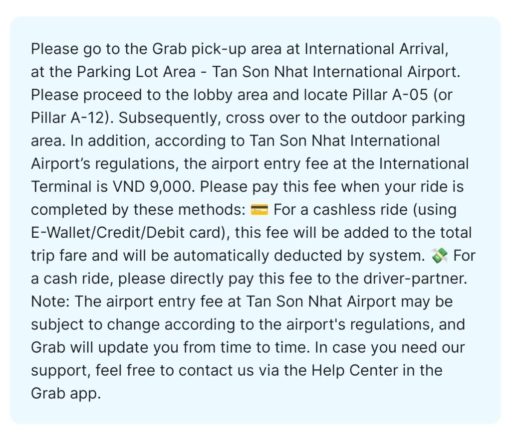 空港使用料は、2026年2月時点で9,000ドン。Grabアプリに紐付けたクレジットカード等で運賃を支払う場合(キャッシュレス決済の場合)は勝手に引き落としされ、現金で支払う場合は運賃と併せてドライバーに支払います。