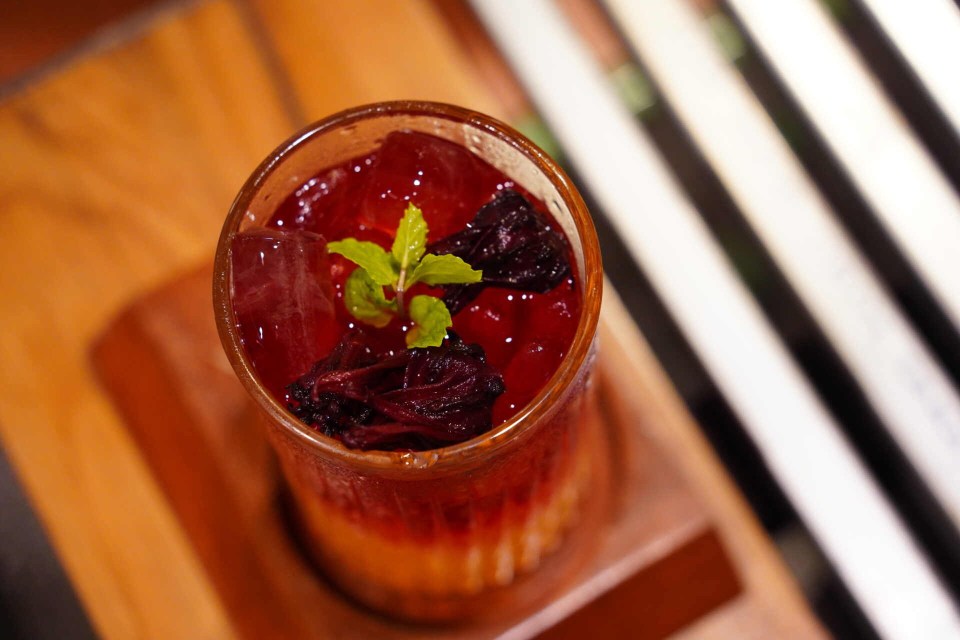 「Trà Hibiscus Cam Đào(ハイビスカスオレンジピーチティー)」49,000ドン。鮮やかな赤色が目を引くこちらは、ハイビスカスティーをベースに、オレンジとピーチのシロップを合わせたもの。