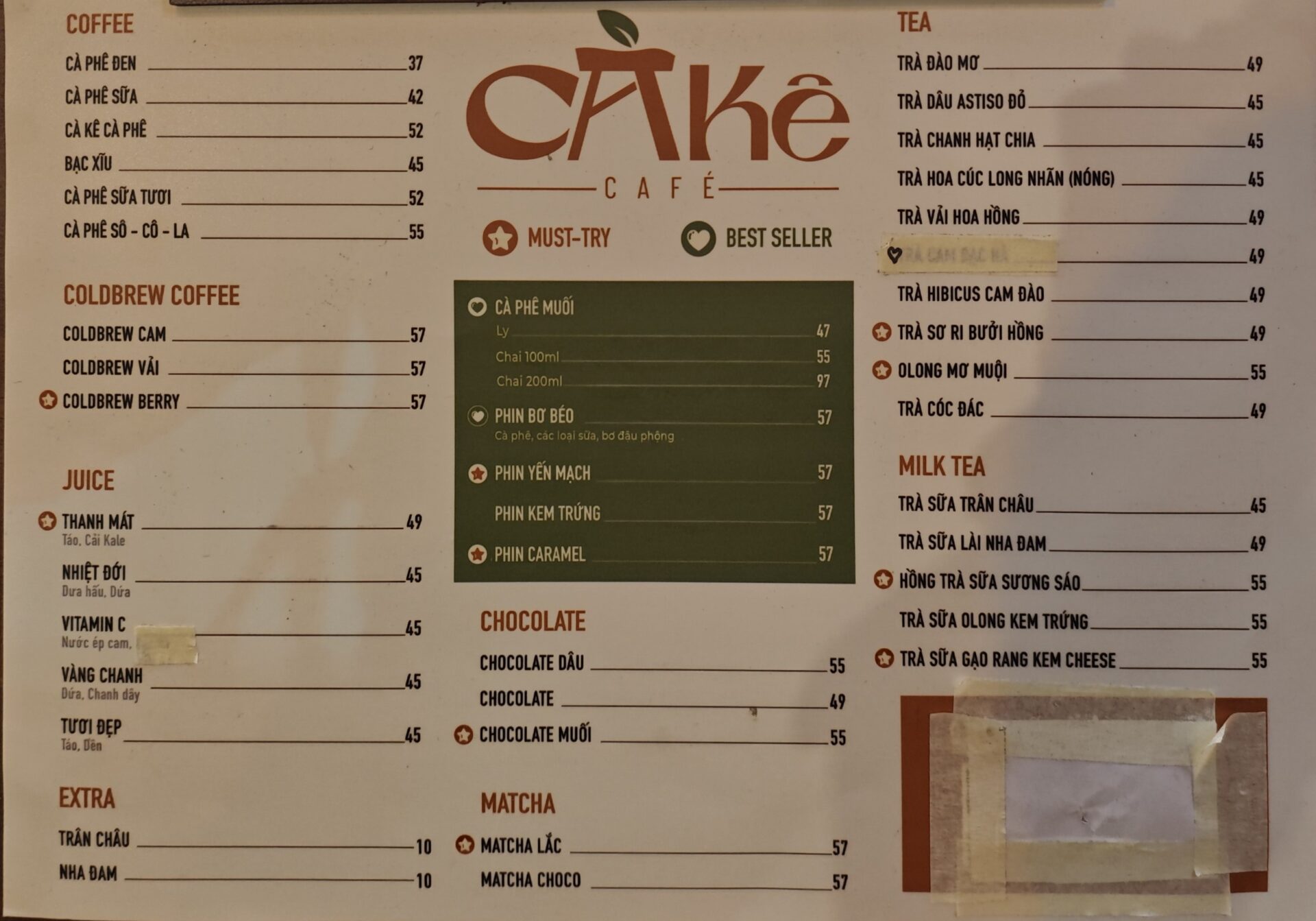 「Cà Kê Café」のメニューはこちら。学生街らしく、リーズナブルな値段設定。