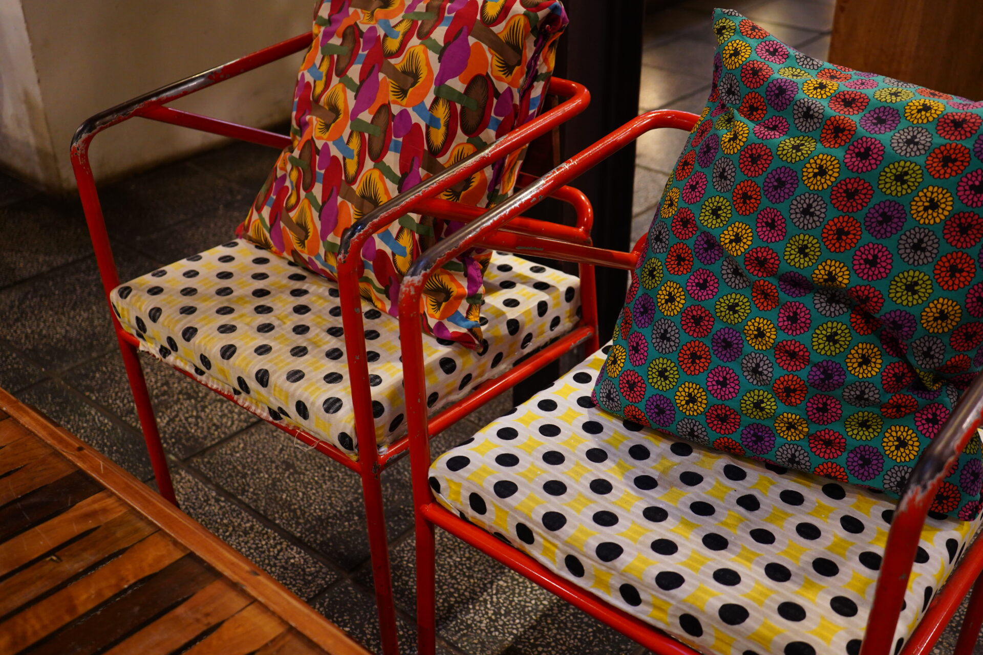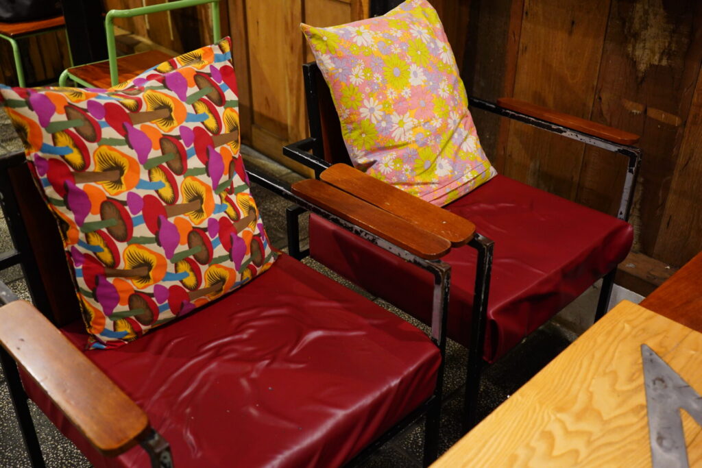 ソファや椅子に置かれたクッションたちはキノコ柄やドット柄、レトロな花柄など、一見バラバラ。ですが、それらが赤いビニールレザーのソファやパイプ椅子と妙にマッチしており、結果として空間全体にレトロ・ポップな彩りを添えています。