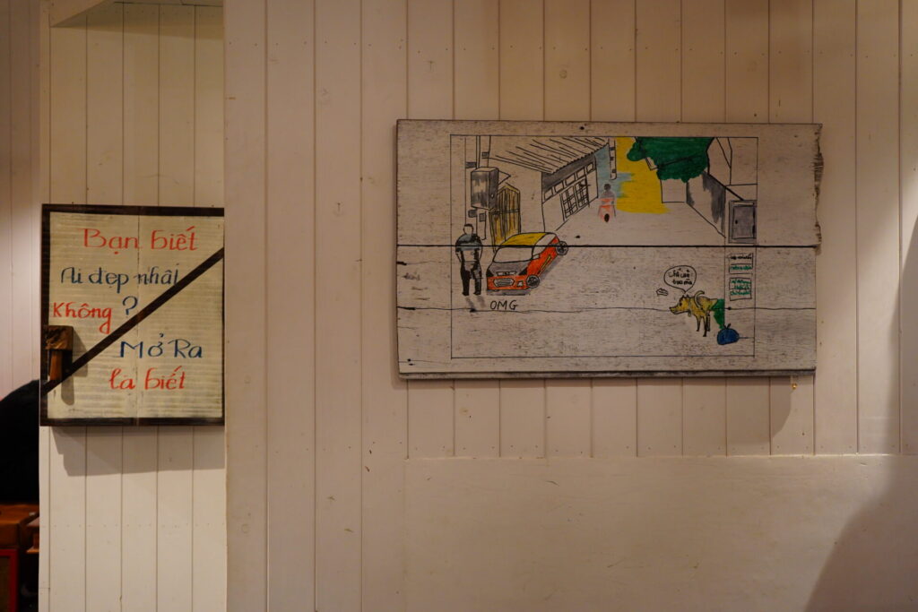 木板に描かれたシュール…もとい味のある手書きのイラストや、「あなたは誰が一番美しいか知ってる?開けてみて(Bạn biết Ai đẹp nhất không? Mở ra là biết)」というメッセージ。ちなみにその先はトイレでございます。