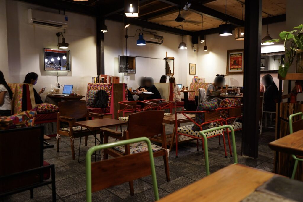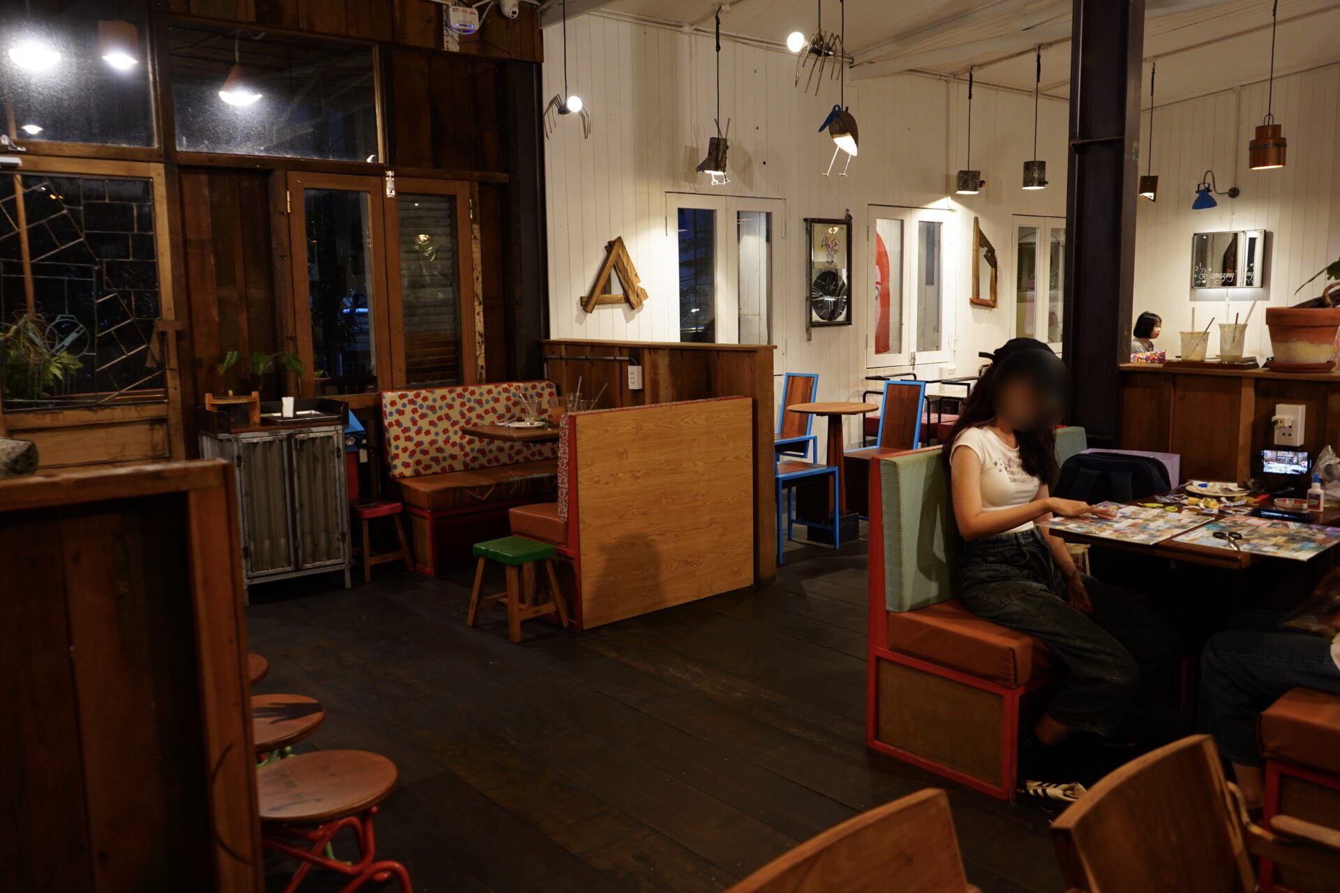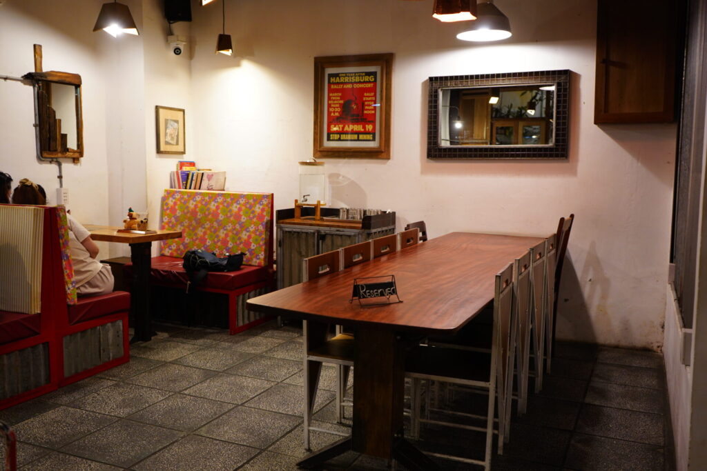 店内は本棚がパーティションのように配置されており、それぞれの席に適度なお籠り感があります。ペンダントライトが、ヴィンテージ調の木目家具や本の背表紙を優しく照らし、ムーディーで落ち着いた雰囲気を醸し出している。