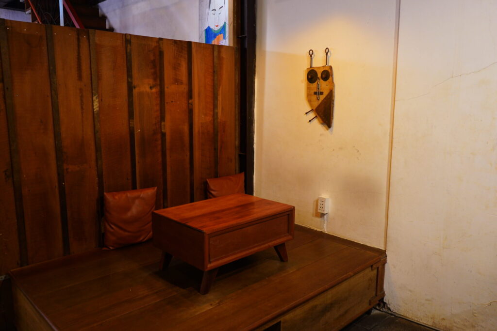 日本人としてはホッとする?階段下のスペースなどを活用した小上がり席。靴を脱いで上がり、低いテーブルを囲んでクッションに身を委ねる…いいねえ〜。
