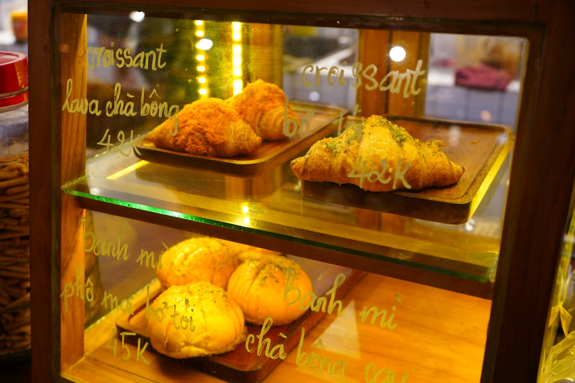 また、レジ横のショーケースには、ベトナム人におなじみの「肉でんぶ(Chà Bông)」と塩卵ソースを使ったクロワッサンや、ガーリックバターパンなどが並びます。あまり惹かれる見た目ではなかったが…。