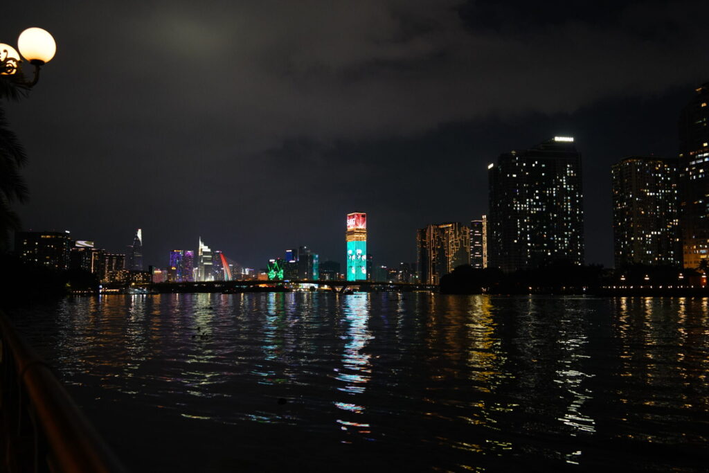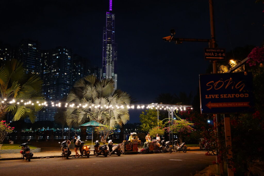 不安になりながら歩を進め、目に飛び込んできたものは…サイゴン川の漆黒の川面とは対照的に、対岸に煌めくビンホームズ・セントラルパークの近代的な高層ビル群とランドマーク81。あらン素敵。