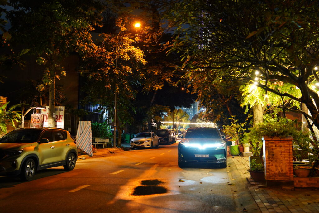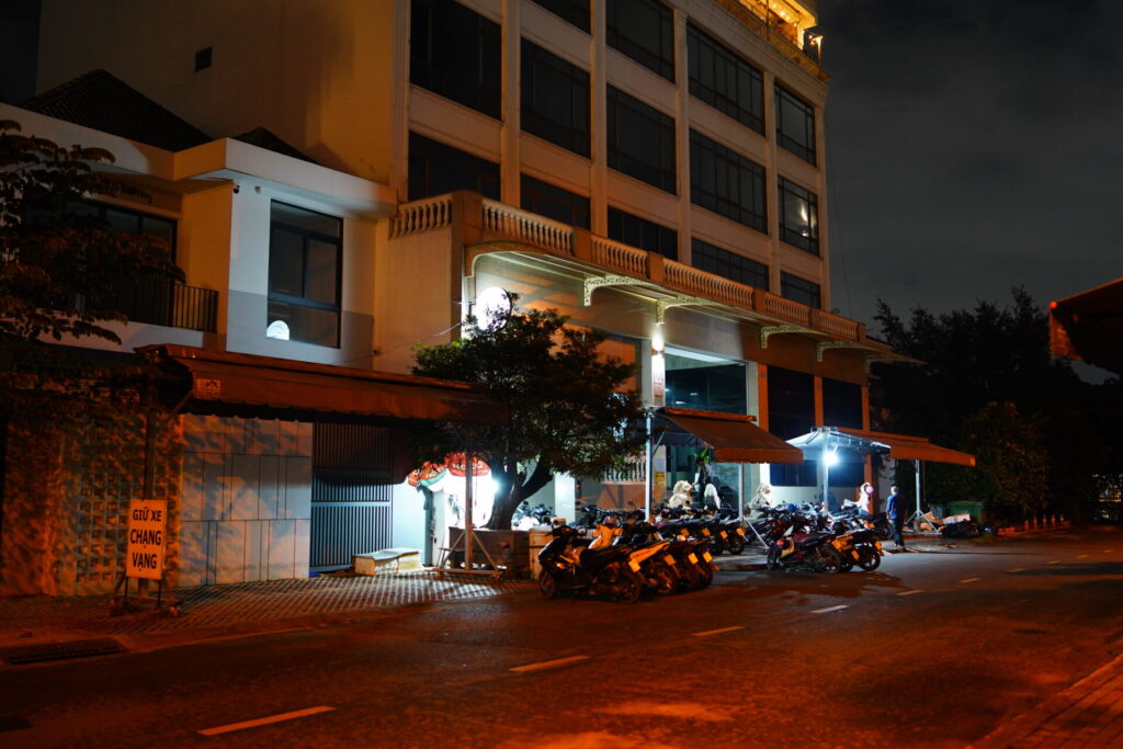 住所を頼りにGrabで向かうと、到着したのはサイゴン川沿いの少し奥まった通り(Đường Số 38)。あたりは街灯も少なく、夜になるとひっそり。写真では明るく撮れていますが(f/1.4の単焦点を持ち出しました)、実際は真っ暗です。