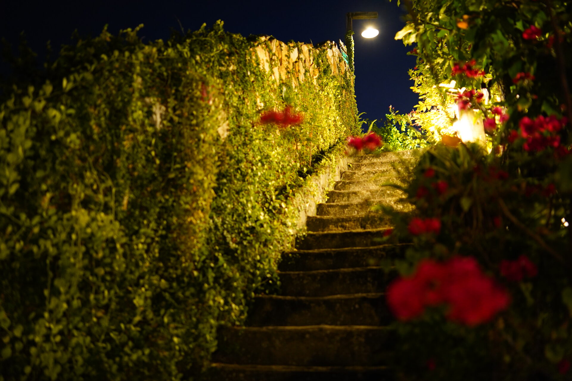お次は屋上エリア。フロアをつなぐのは、両脇にブーゲンビリアや植物が生い茂る石階段。足元のライトアップが植物を幻想的に照らし出し、まるで緑のトンネルをくぐり抜けるようなロマンチックな作りなんですのよ。