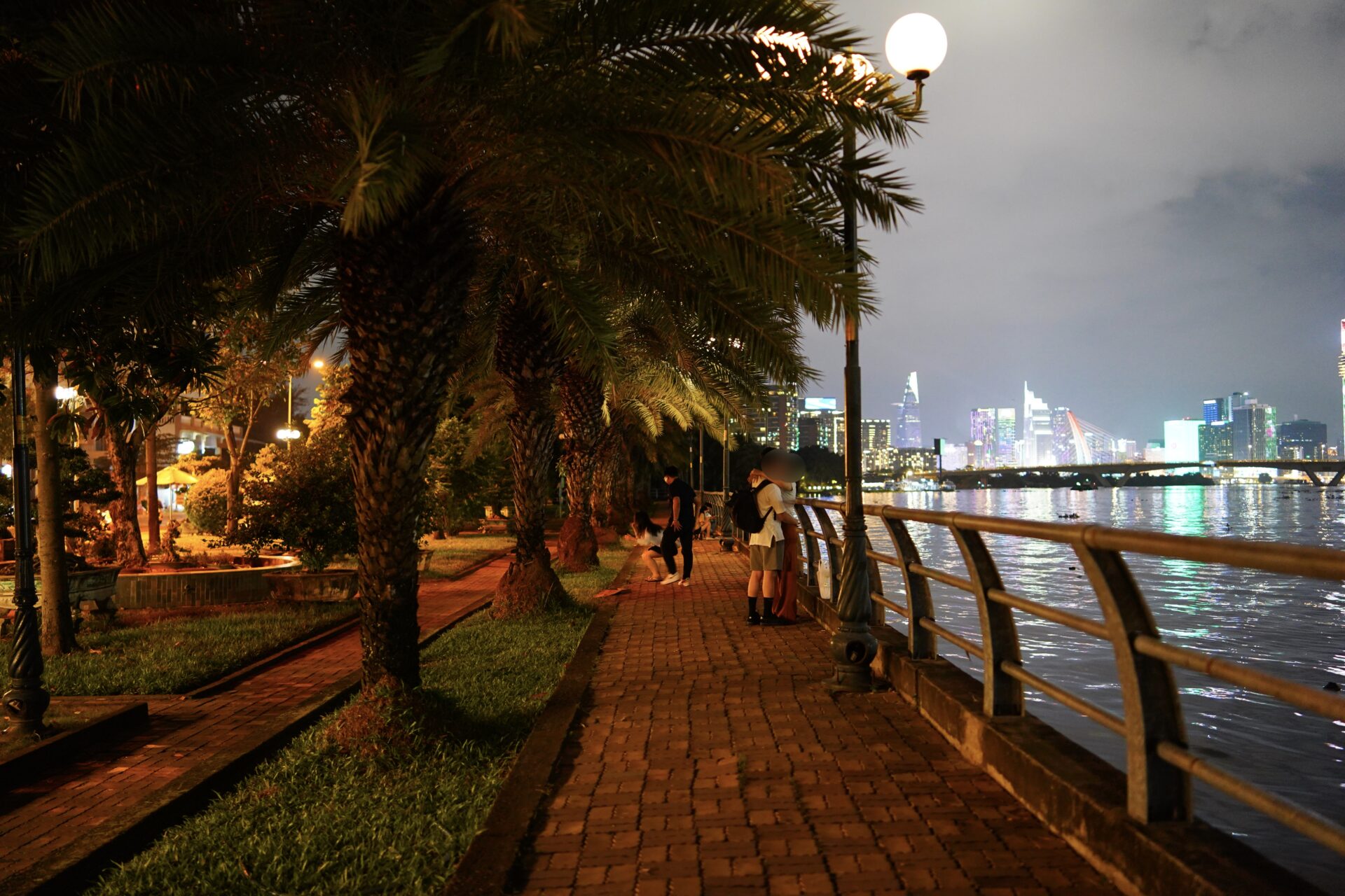 不安になりながら歩を進め、目に飛び込んできたものは…サイゴン川の漆黒の川面とは対照的に、対岸に煌めくビンホームズ・セントラルパークの近代的な高層ビル群とランドマーク81。あらン素敵。