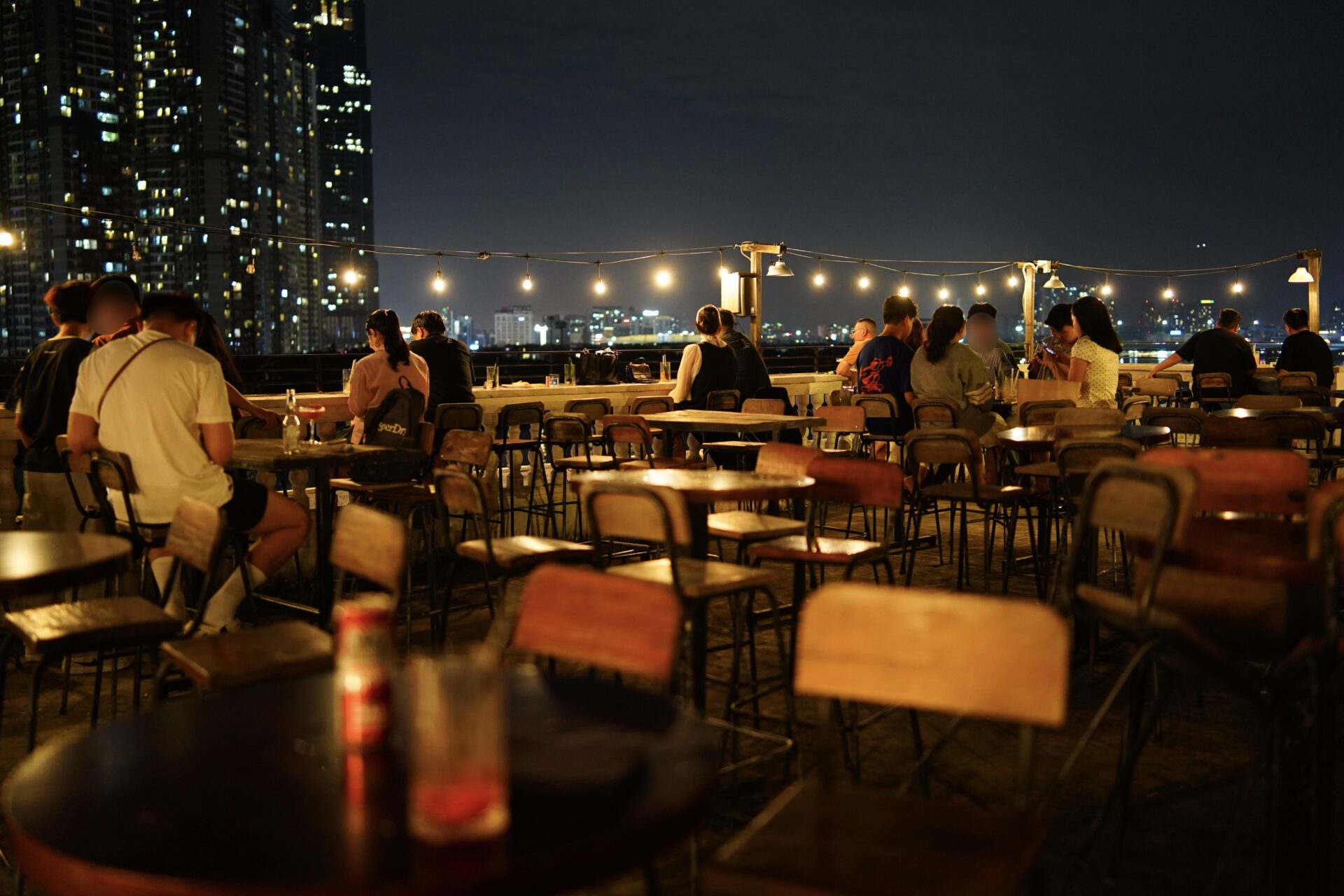 屋上の席は、シンプルな木製テーブルや鉄製のチェアが並べられ、どこか野外キャンプやナイトマーケットを思わせる、開放的で賑やかな雰囲気。