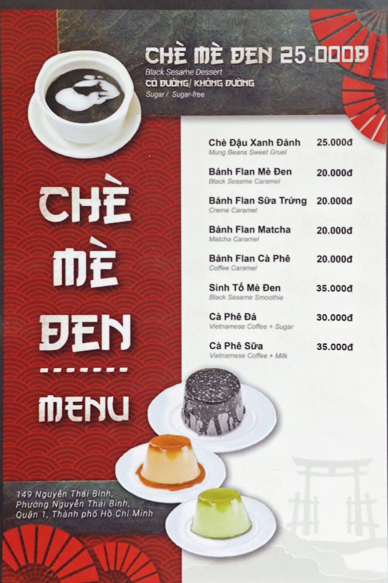 「Chè Mè Đen」のメニューはこちら。英語併記のしっかりしたものです。内容を見るとその専門性の高さにびっくり。店名の通り看板メニューの黒胡麻のチェーを中心に、黒胡麻のプリンやスムージーまで。