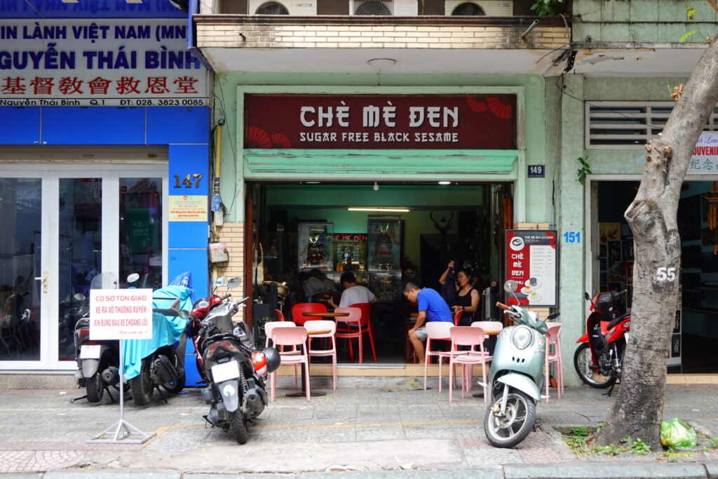 とは言え基本的には地に足のついた生活の気配が漂うエリア。ミントグリーンの優しい色調で整えられ、歩道に向かってオープンに開かれたこちらが「Chè Mè Đen」です。店名はそのまま「黒胡麻のチェー」の意。