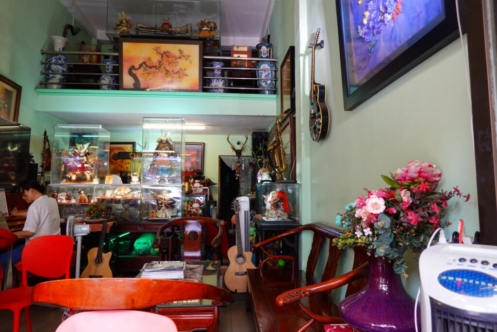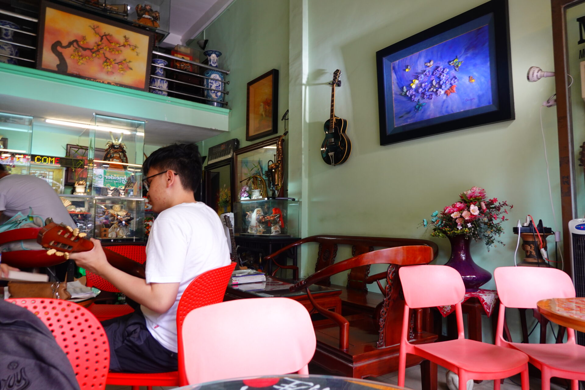 が、店内に一歩入ると目に飛び込んでくるのは、壁一面を飾る数々の楽器や、棚に並んだ日本人形、そして絵画の数々。そして私が訪れた際は、ギターとピアノを絶賛練習中。な、なんなのだここは…?