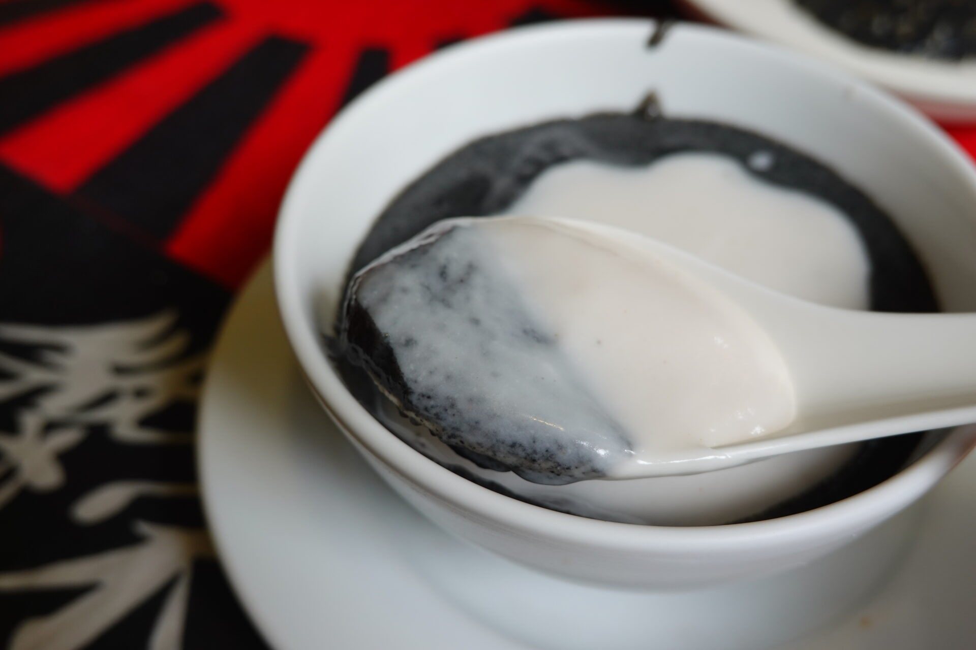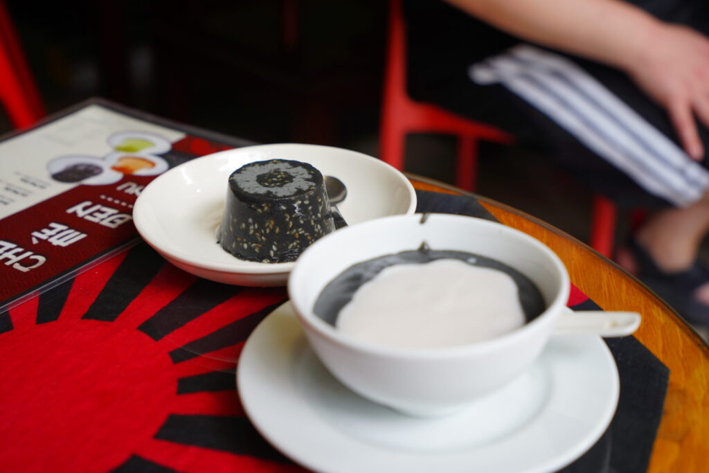 お店のシグネチャーである「Chè Mè Đen(黒胡麻のチェー)」を砂糖不使用 (Không Đường) でいただきました。併せて、黒胡麻プリン「Bánh Flan Mè Đen」も注文。2品を合わせても価格はたったの45,000ドン。
