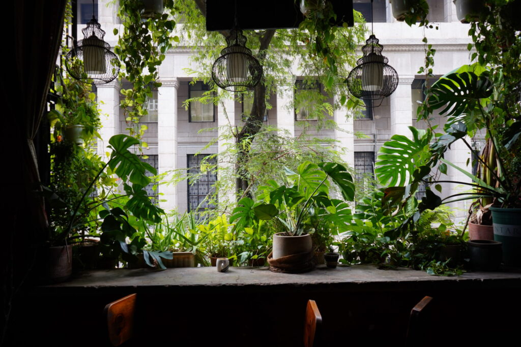 おすすめは、植物に覆われた窓辺の席。窓枠いっぱいに生い茂るモンステラやポトスの緑の隙間から、国家銀行の白い列柱がチラリと見える構図は、どこか幻想的で、物語の中にいるような気分。