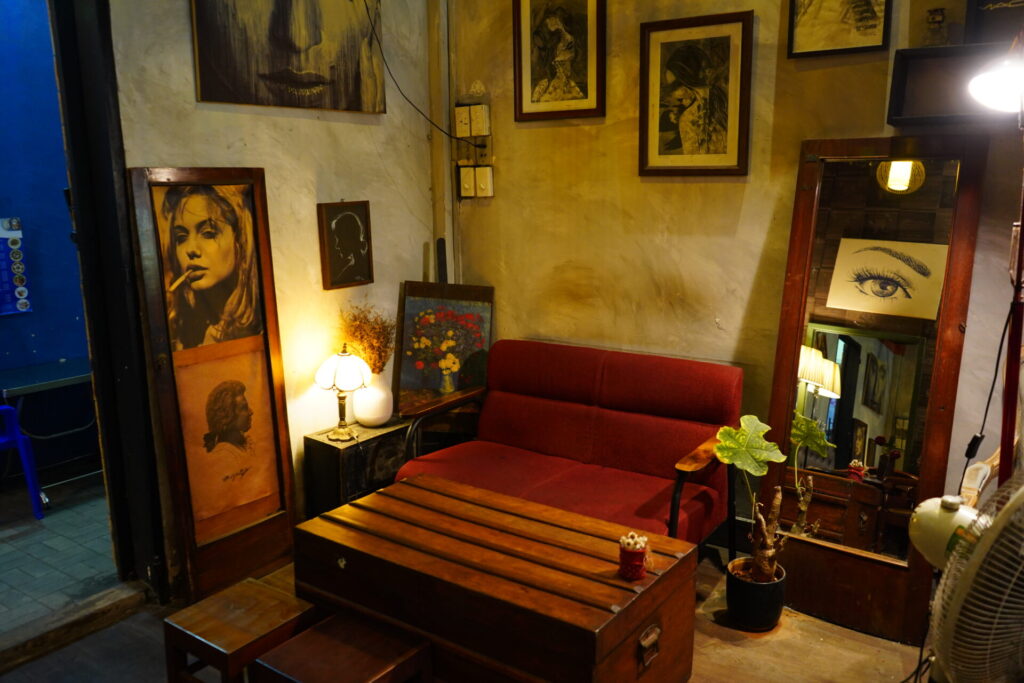 少し落とされた照明の中でデッサン画やギターを眺めていると、ここがホーチミンの中心部であることを忘れてしまいそう。