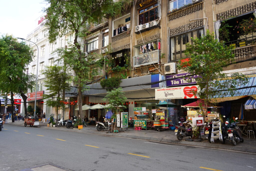 こちらが今回ご紹介する「Chung Cư 14 Tôn Thất Đạm(トンタットダム14番地アパート)」。道を一本挟んだだけで、これほどのギャップ。信用と秩序の権化のような存在とのコントラストこそが、この場所の面白さです。
