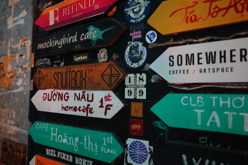 入居しているカフェやショップが掲げた看板があちこちにあります。手書きの看板が多く、味がある。